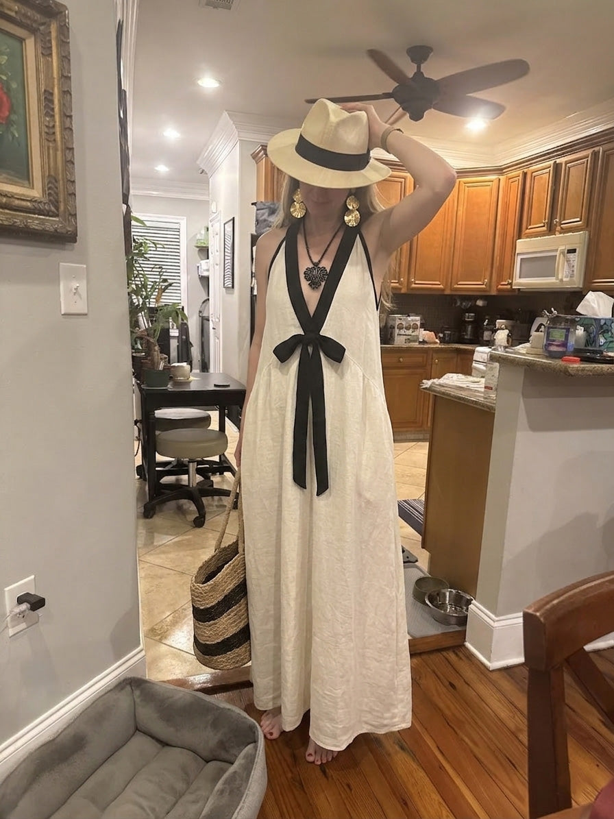 Stylish Simple Sleeveless Color-blocked Ruffled V-neck Cotton Linen Maxi DressStylish Simple Sleeveless Color-blocked Ruffled V-neck Cotton Linen Maxi Dress- Regular price