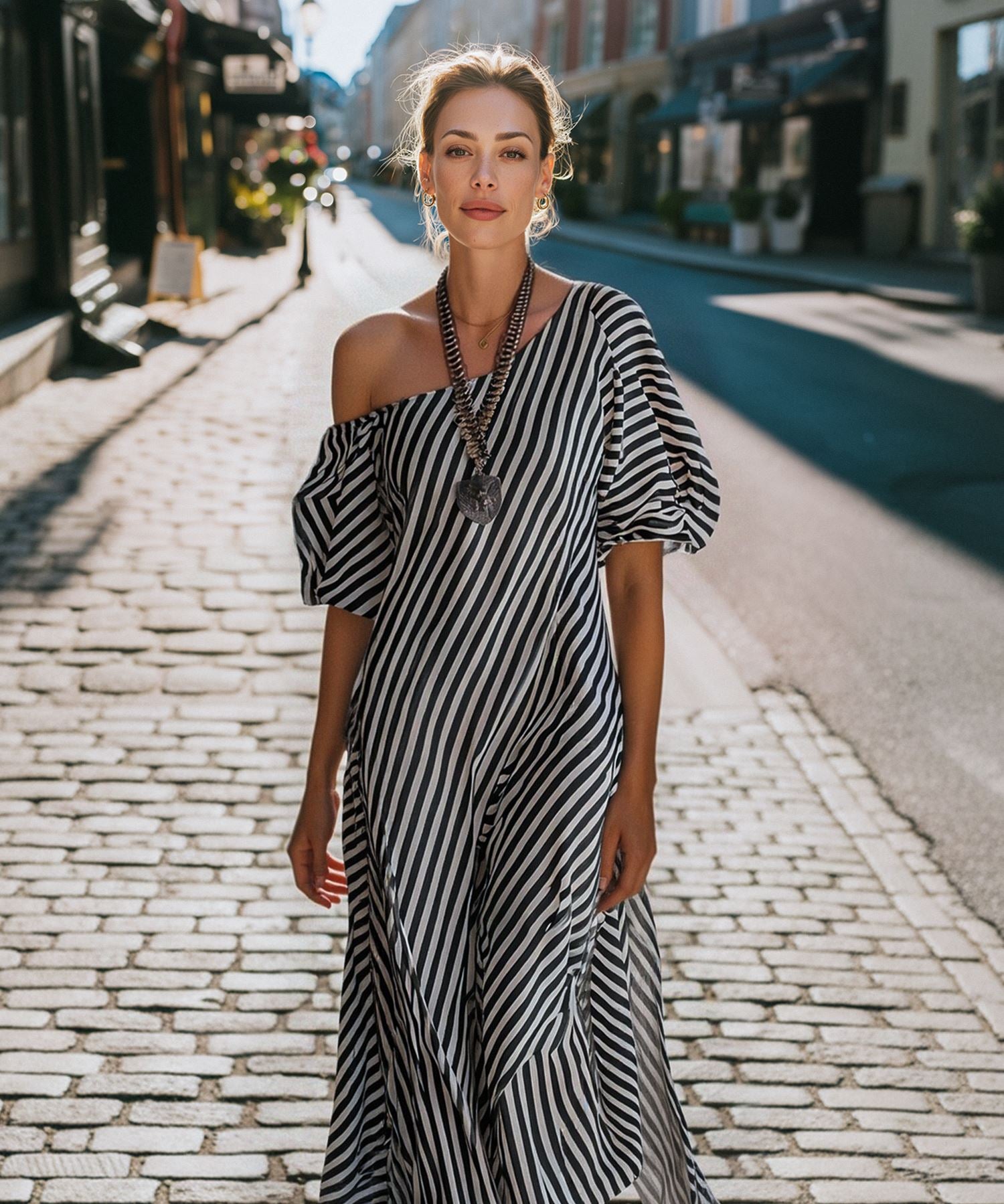 Urban Black Chiffon Striped Print Off Shoulder Maxi DressUrban Black Chiffon Striped Print Off Shoulder Maxi Dress- Regular price