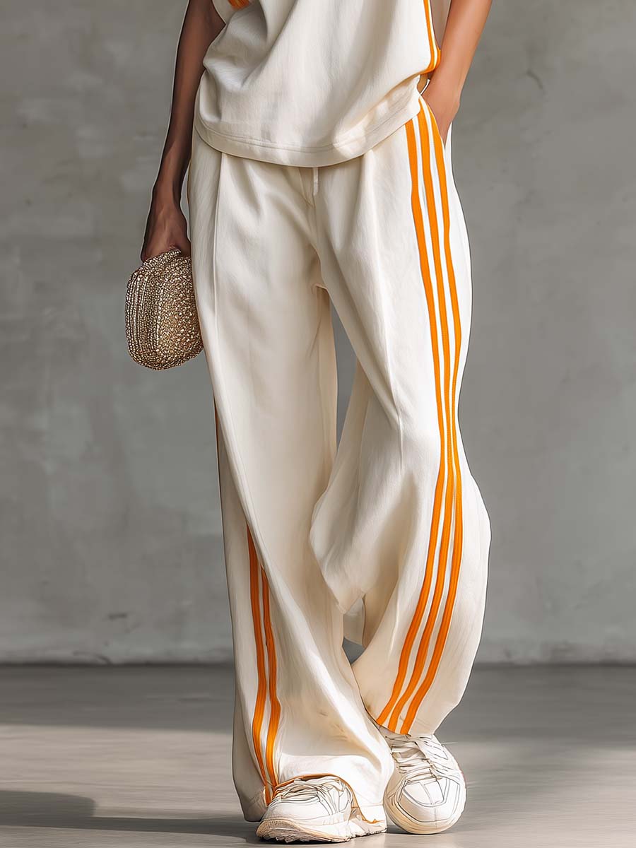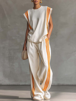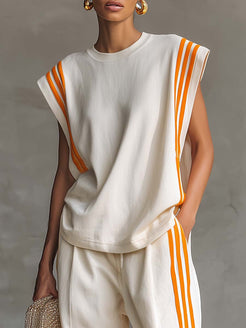 The Casual And Stylish Sporty Round Neck Sleeveless Off-white Cotton Top And Wide-leg Pants Set is an effortlessly chic outfit perfect for a variety of occasions. This two-piece set includes a sleeveless top and coordinating wide-leg pants, both made from comfortable, breathable cotton fabric in a sophisticated off-white color. The design embodies a sporty yet elegant aesthetic, making it an ideal choice for those seeking comfort without compromising style.