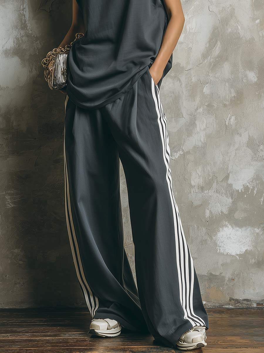 Introducing our casual yet stylish sporty top and pants set, designed to provide comfort and versatility while maintaining a chic look. This set includes a sleeveless, crew neck top and matching pants, both crafted from high-quality dark gray cotton fabric, featuring elegant white stripes that add a modern touch.