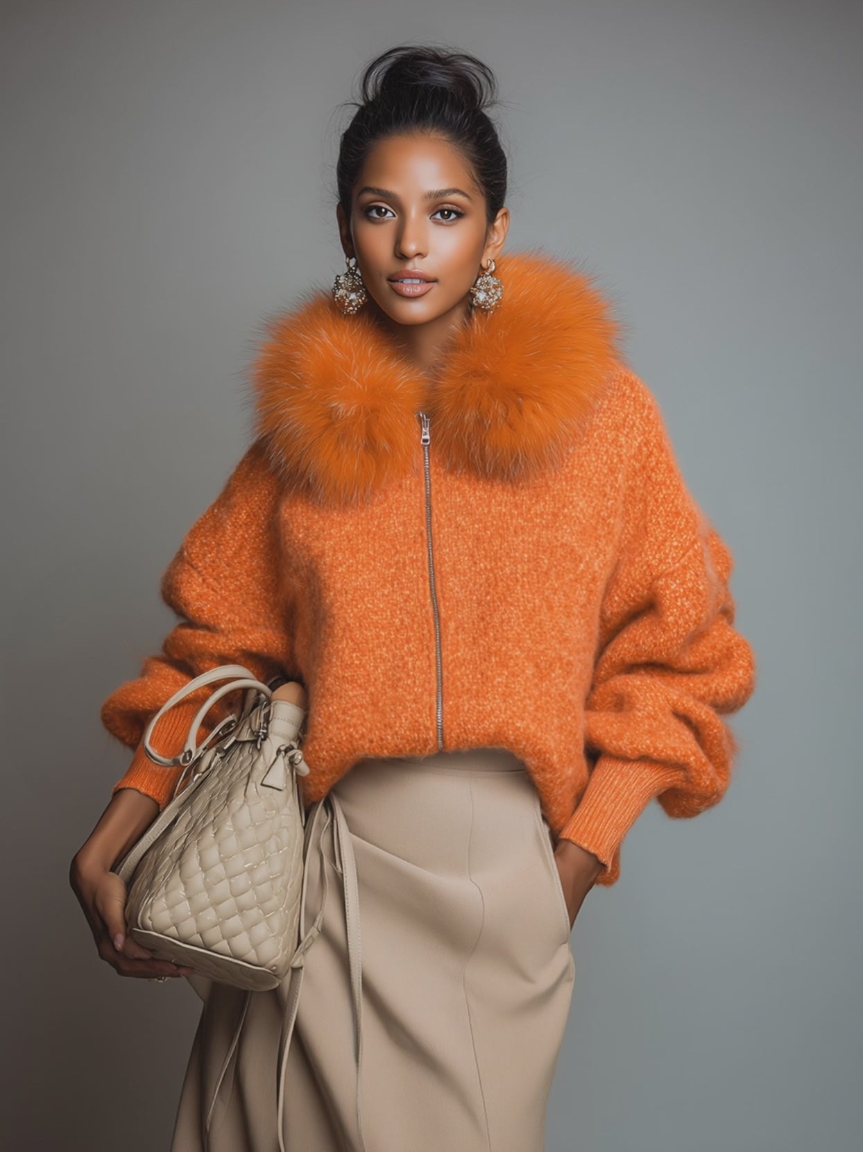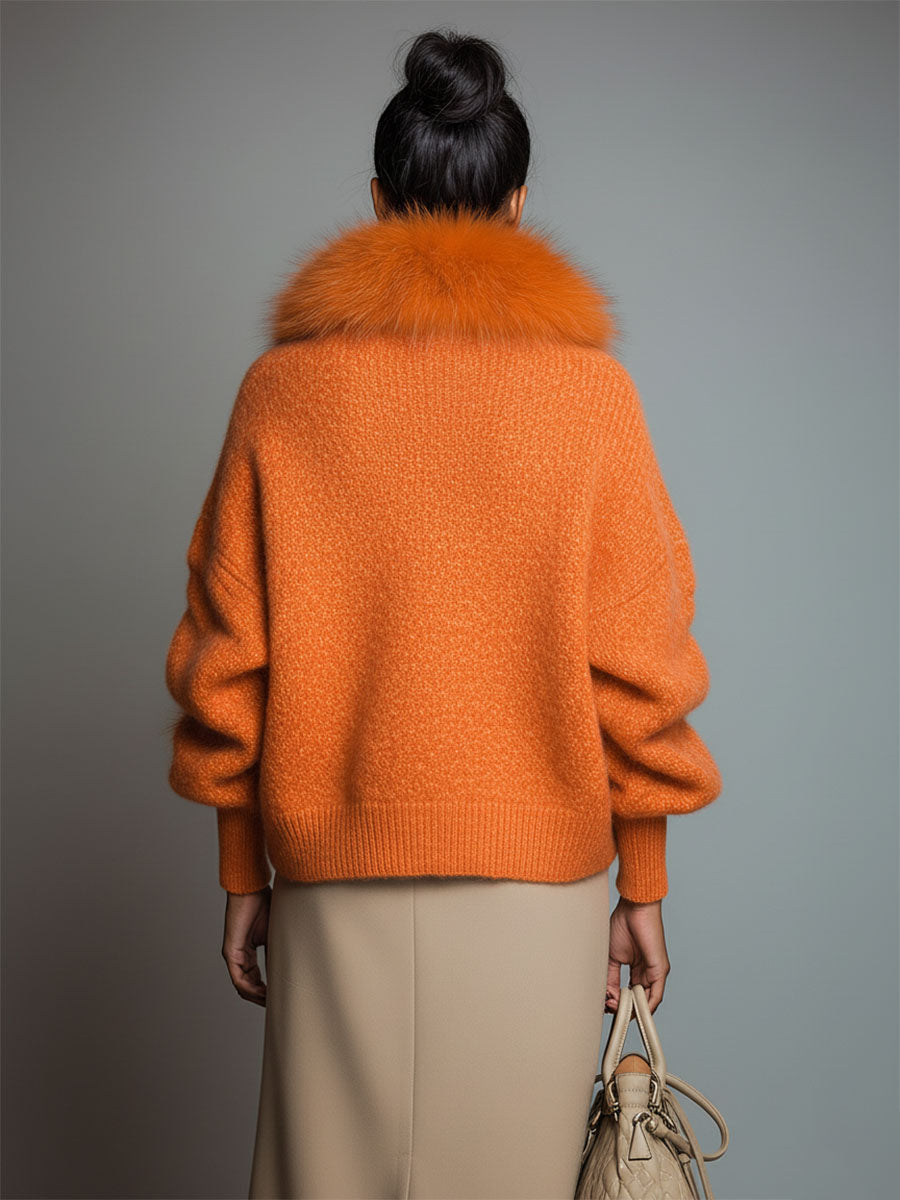 This cardigan is incredibly versatile; it can be layered over a simple tee and jeans for a relaxed daytime look or worn with a fitted dress and ankle boots for a more fashionable outing. Pair it with tailored trousers for a chic office outfit or with leggings for lounging at home. The Casual Loose Faux Fur Collar Orange Zipper Front Cardigan is a fun and trendy piece that ensures you stay stylish and warm throughout the seasons.