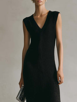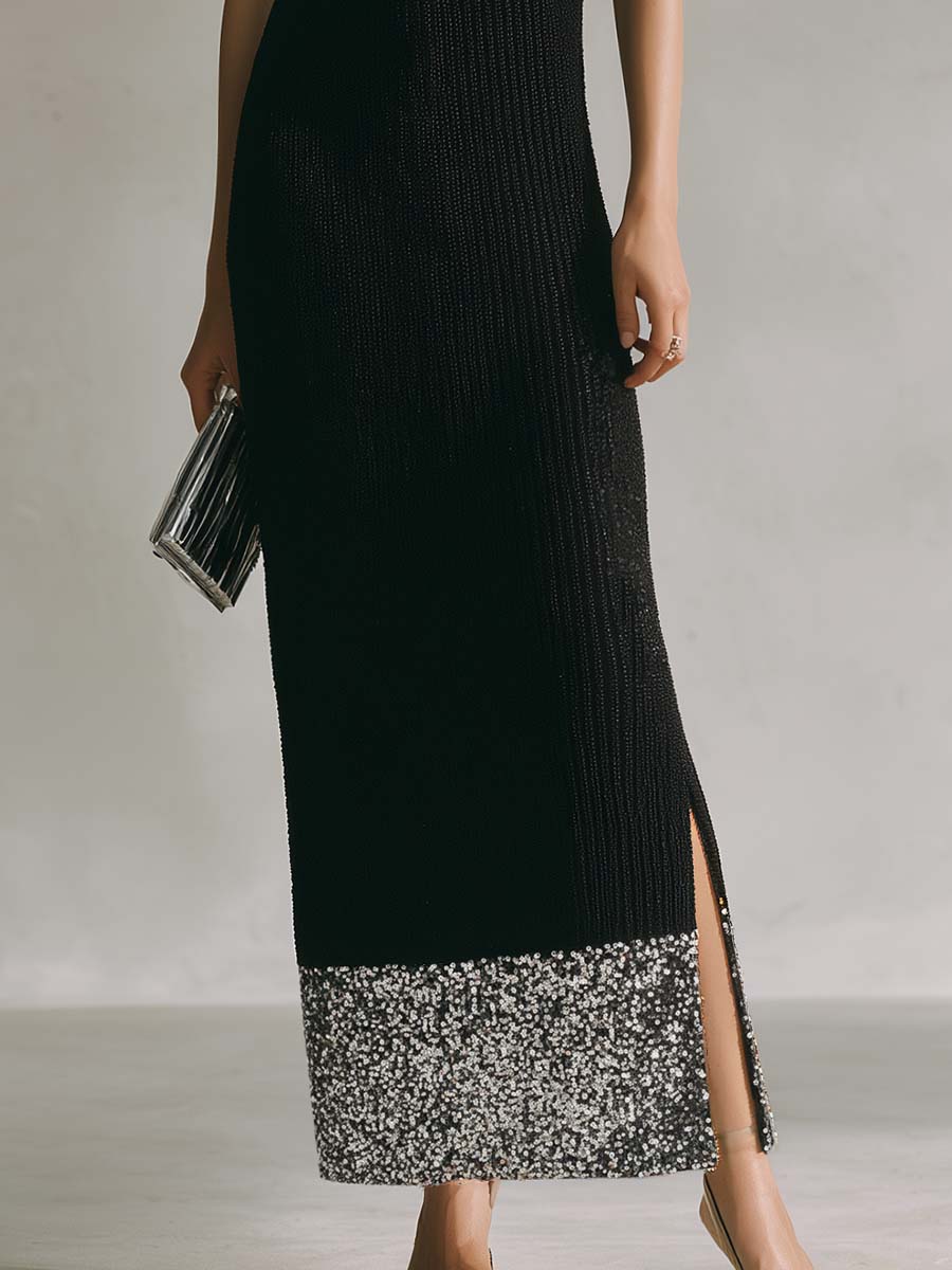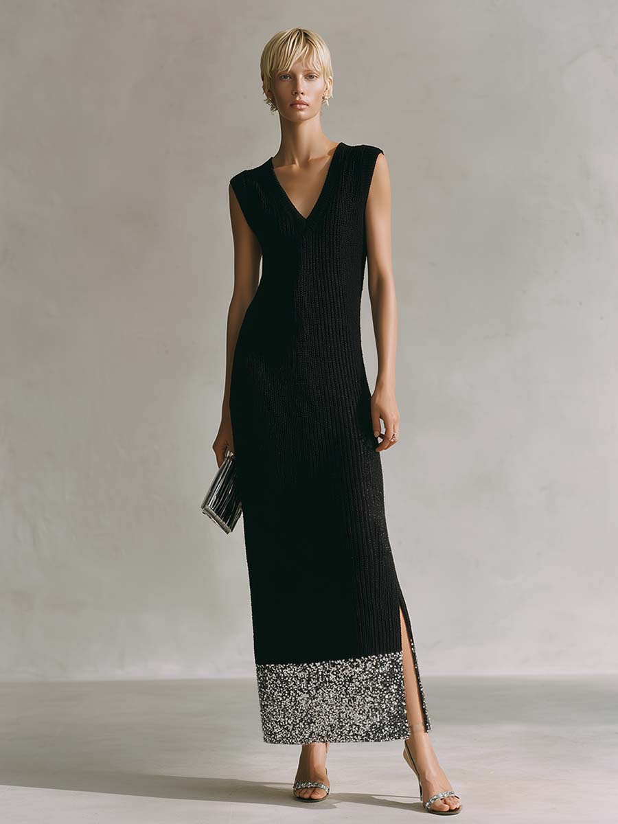 The Elegant Fashion Party V-neck Sleeveless Sequined Hem Black Knit Slit Maxi Dress is the epitome of sophistication and glamour. This dress is designed to make you stand out at any event, featuring a stunning black knit fabric that gracefully drapes over the silhouette. The V-neckline and sleeveless design offer a timeless and elegant appeal, while the sequined hem adds a touch of sparkle and luxury.