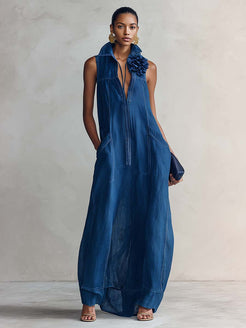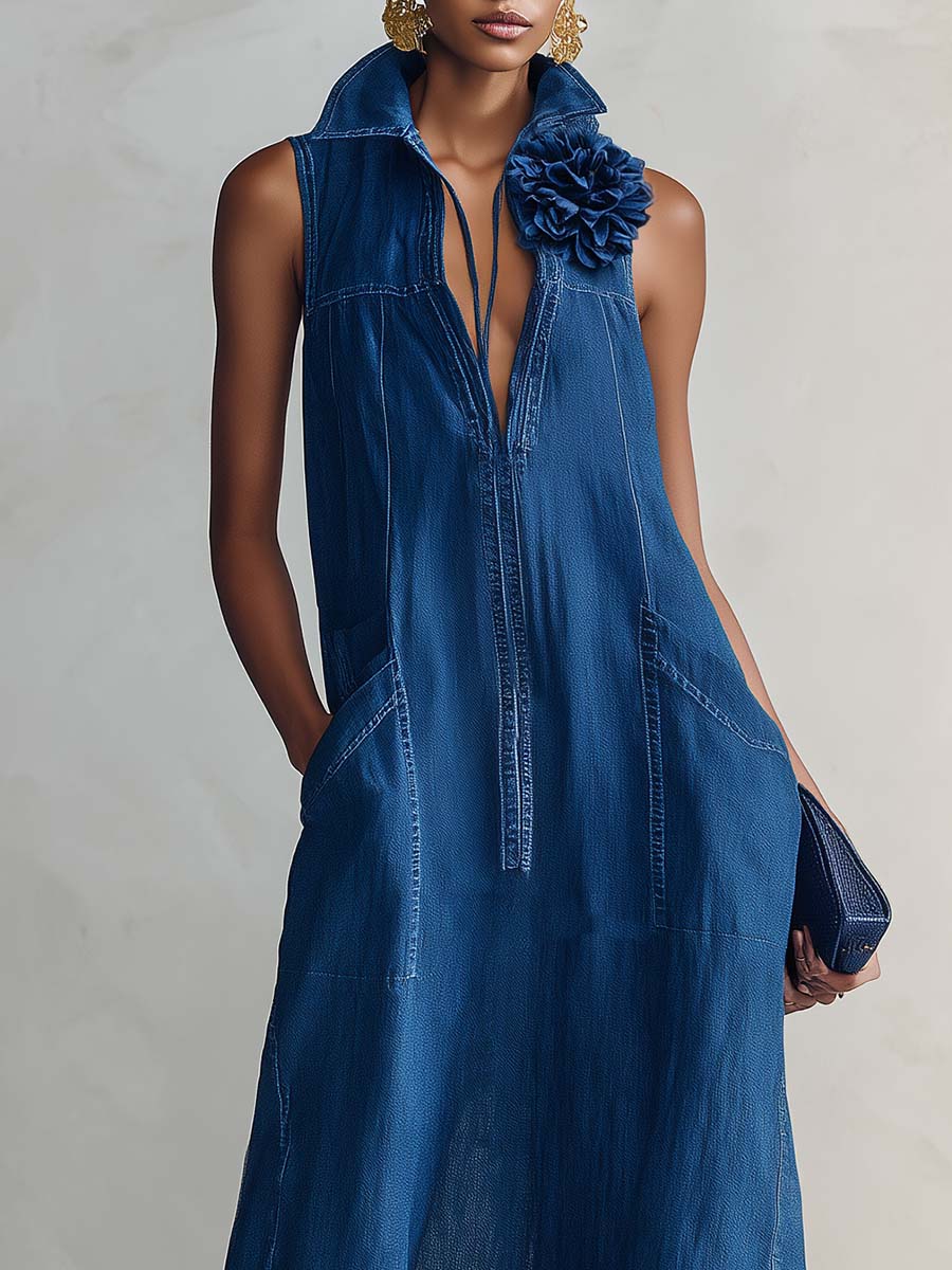 Step into the timeless elegance of the Elegant Retro Lapel Front Lace Up 3D Floral Embellishments Dark Blue Denim Maxi Dress. This dark blue denim maxi dress is a sophisticated blend of classic and contemporary style, adorned with striking 3D floral embellishments that elevate its aesthetic to new heights of fashion-forward design.