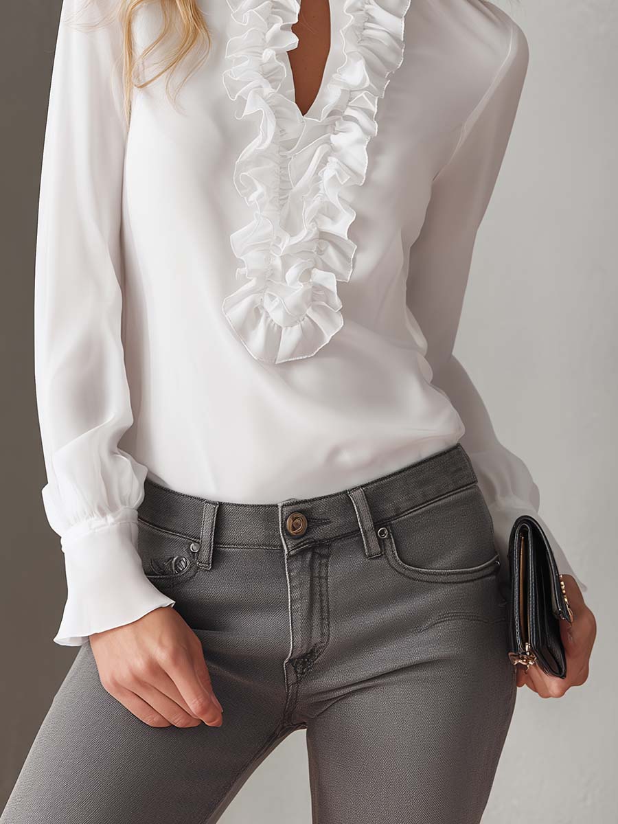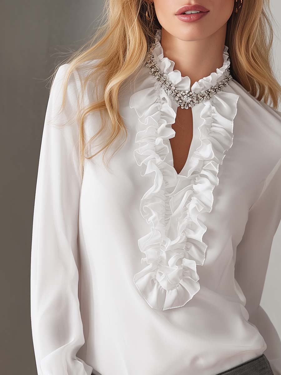 This exquisite white chiffon blouse is the epitome of elegance, featuring a unique openwork collar that is adorned with a sophisticated silver chain decoration. The delicate ruffles add a charming and feminine touch to the overall design, making it a perfect choice for both formal and casual occasions.