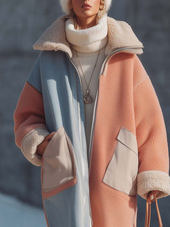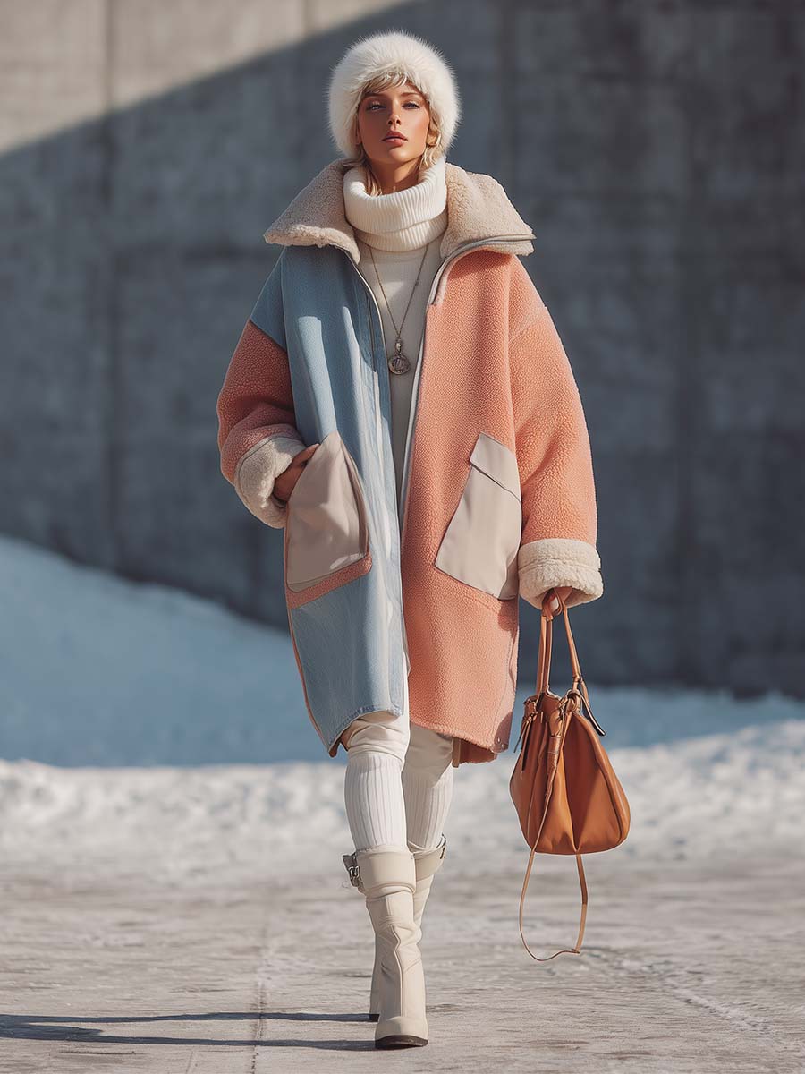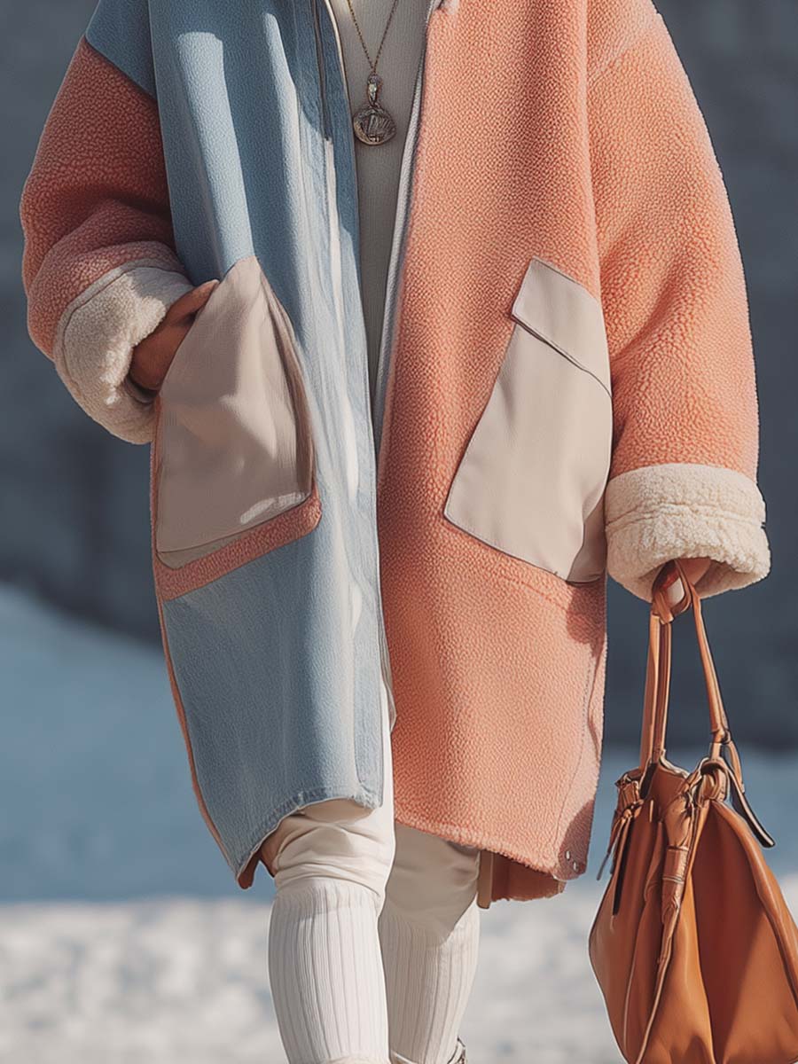 This fashionable outdoor coat features a striking combination of light blue denim and lotus pink polar fleece. Its unique design not only offers warmth and comfort but also ensures you stand out in style. The use of premium fabrics makes it ideal for those chilly days while keeping your look chic and on-trend.