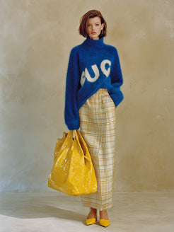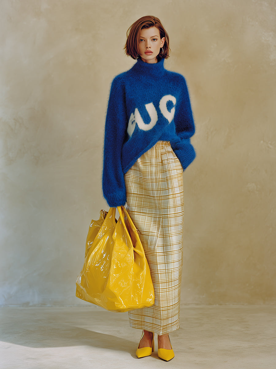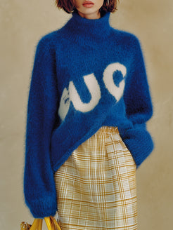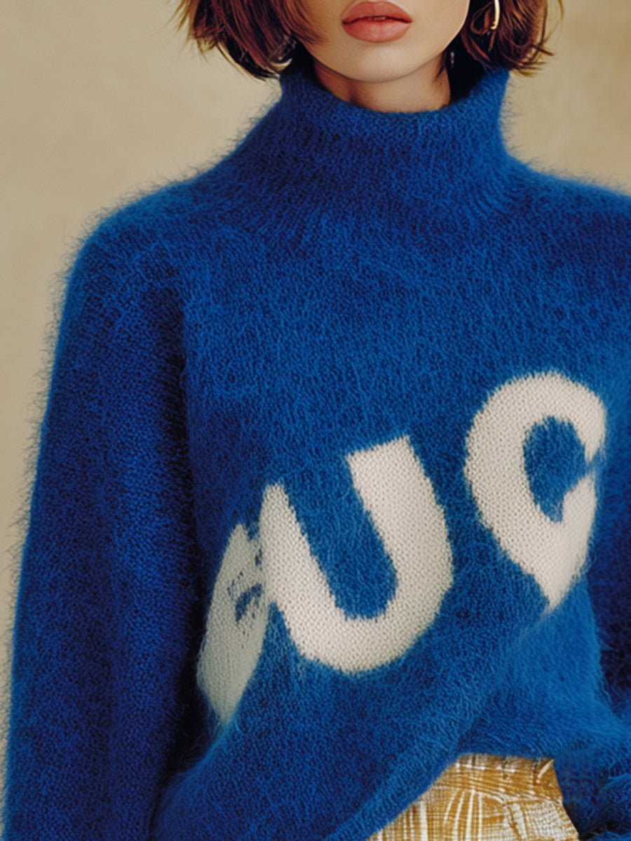 Precision in design is evident through the expert craftsmanship, ensuring a flattering fit that drapes gracefully over the body. The fuzzy texture of the mohair adds dimension and visual interest, while the relaxed silhouette allows for versatile styling options. Pair this sweater with slim-fit jeans or tailored trousers to create a balanced look that highlights the sweater's unique design. For an elevated ensemble, consider combining it with a sleek skirt and ankle boots for a chic yet comfortable appearance. Whether worn for a casual outing or a more upscale event, the High-End Fashionable Turtleneck Letter Blue Mohair Sweater exudes both luxury and contemporary charm, making it a must-have for any fashion-forward wardrobe.