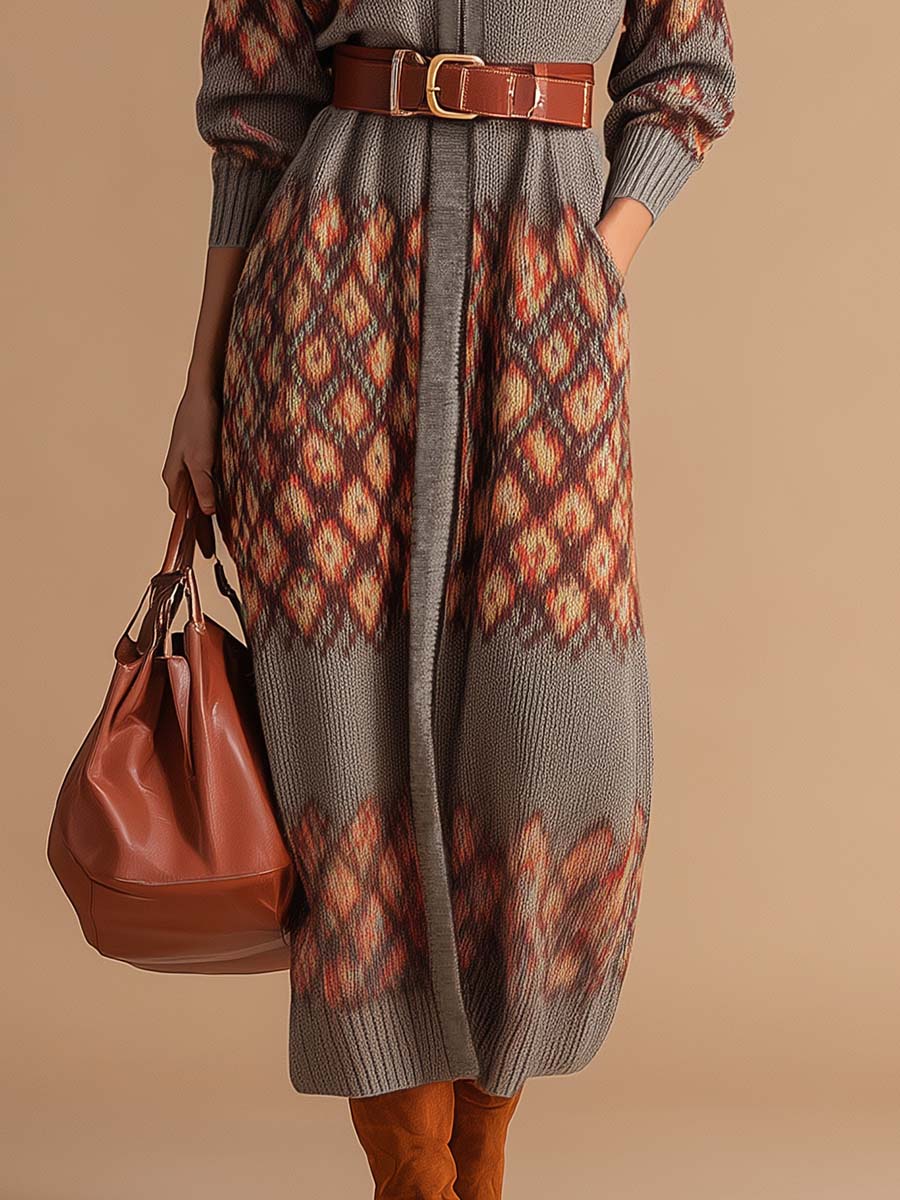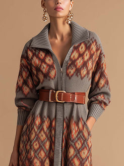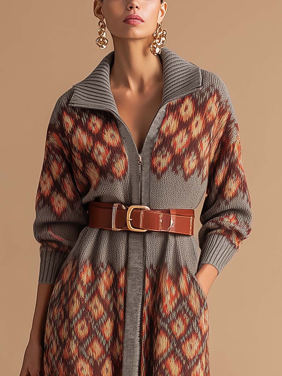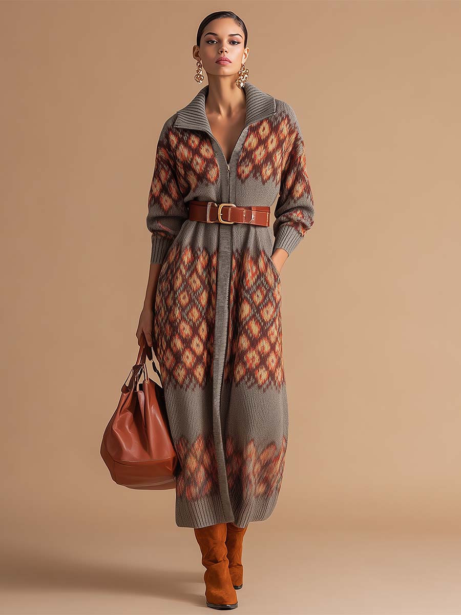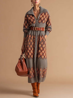 Introducing our exquisite High-end Temperament Fashion Lapel Front Zipper Diamond Pattern Gray Knitted Maxi Dress. This elegant piece combines chic sophistication with unparalleled comfort, crafted to elevate your wardrobe to new heights. The dress features a front zipper design, allowing for easy wear and a touch of modernity, while the diamond pattern adds a classic yet contemporary flair.