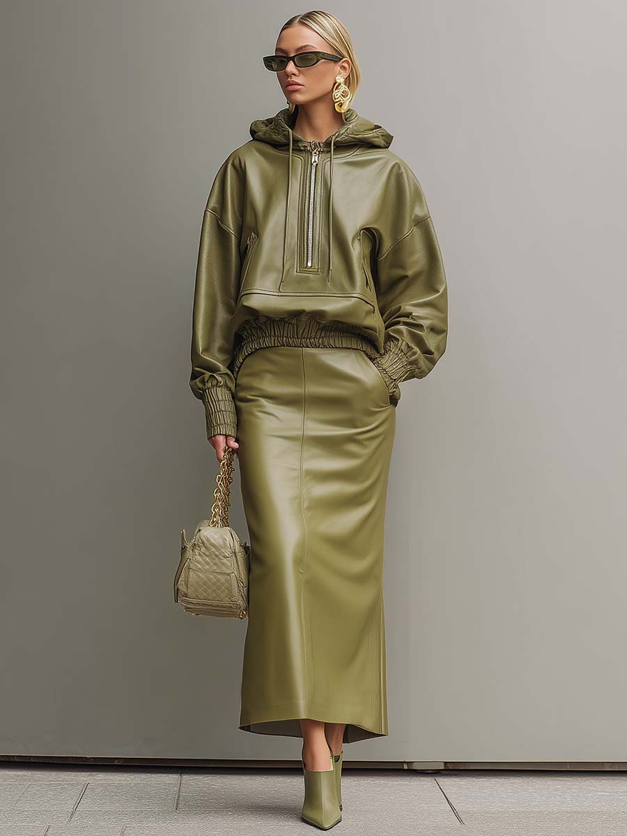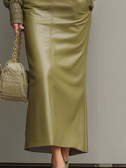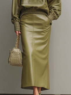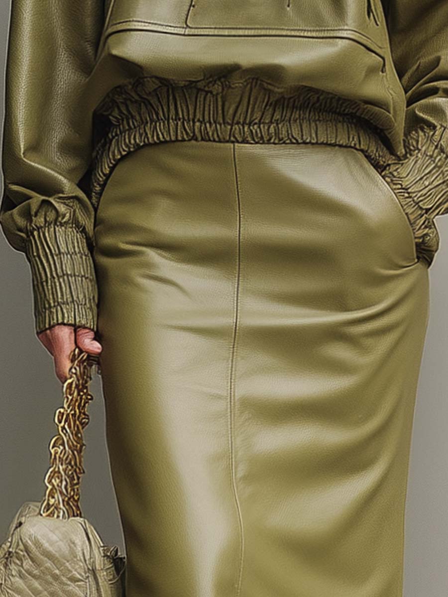 This stylish and eco-conscious leather skirt comes in a vibrant fruit green color, making it a perfect statement piece for those who value both fashion and sustainability. The straight silhouette offers a sleek look, while the rear slit adds a touch of sophistication and ease of movement.