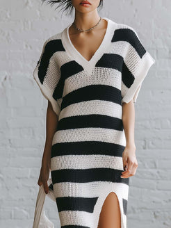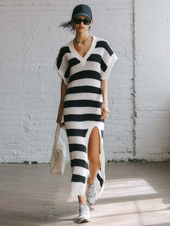 The Retro Breathable Sporty V-neck Short-sleeved Black And White Striped Knit Slit Midi Dress is a perfect blend of classic style and modern comfort. This dress features a timeless black and white stripe pattern that adds a touch of retro charm. The V-neck design, combined with short sleeves, provides a sporty and casual look that is both versatile and stylish.