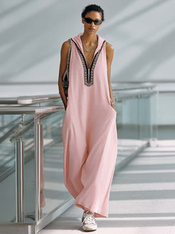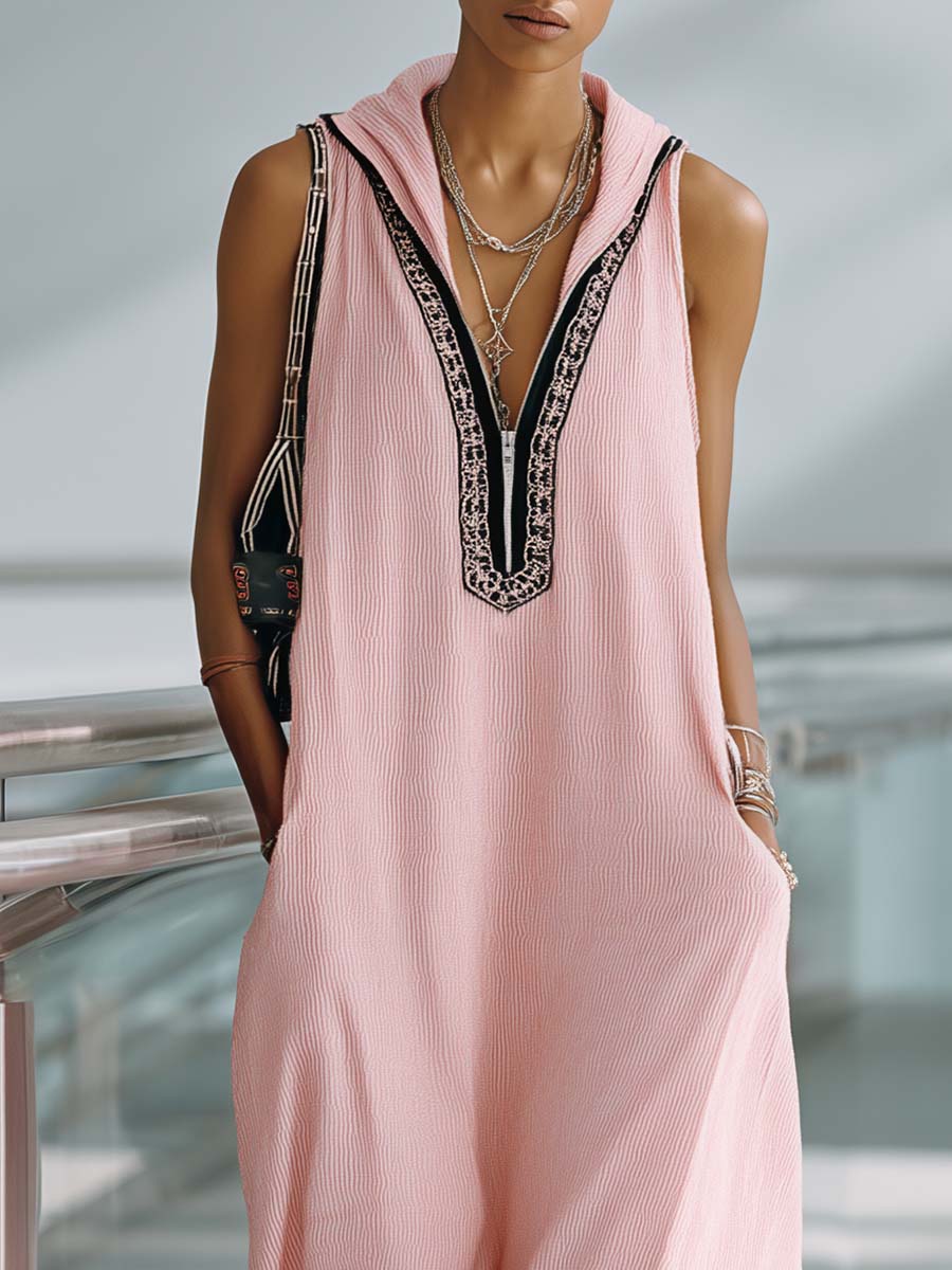 The Retro Casual Loose Hooded Embroidered V-neck Front Zip Light Pink Knitted Maxi Dress combines style and comfort, making it an ideal choice for any occasion. Featuring a beautiful light pink color, this dress showcases intricate embroidery, adding a unique touch to its overall design.