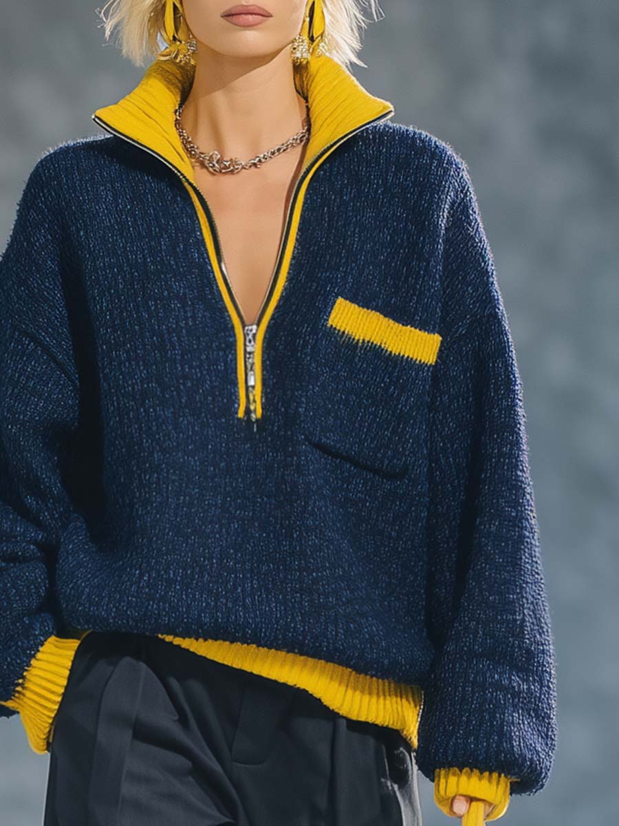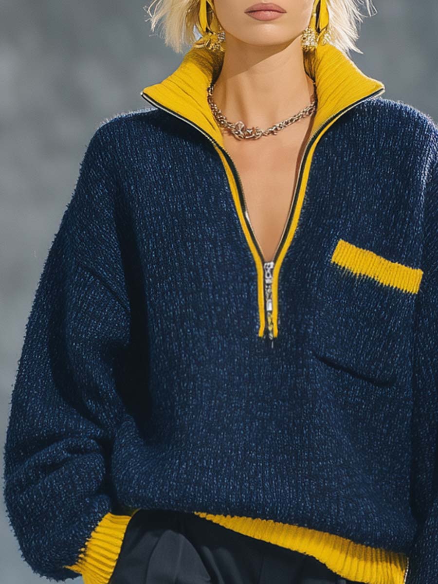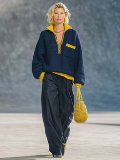 This Retro Exquisite Sporty Yellow Contrast Lapel Front Zipper Dark Blue Knitted Pullover Top takes the timeless appeal of retro fashion and combines it with contemporary sporty elements. The visually striking yellow contrast lapel adds a vibrant touch to the deep, dark blue base, making it a standout piece in any wardrobe. This pullover top features a front zipper that provides a customizable style, ensuring a comfortable fit for any occasion.