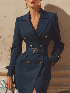 Introducing the Retro Exquisite Street Style Large Lapel Front Double-breasted Metal Button Dark Blue Trench Coat. This trench coat offers a timeless design combined with contemporary elements, making it an elegant addition to any wardrobe.