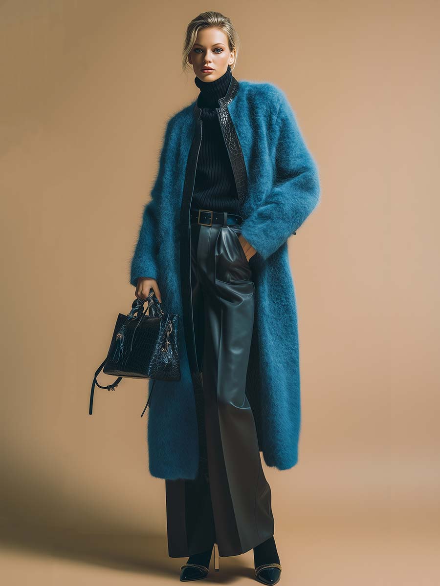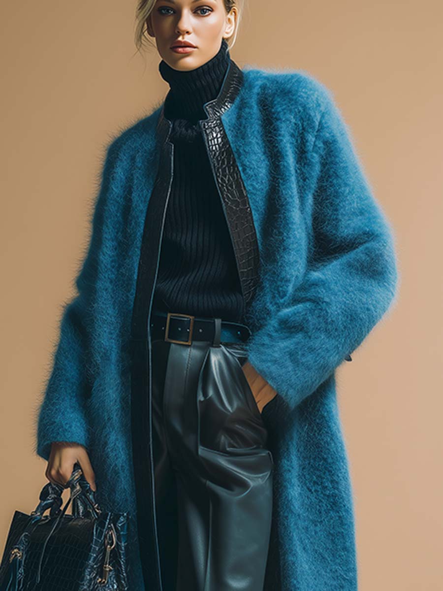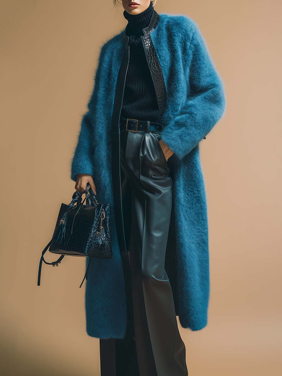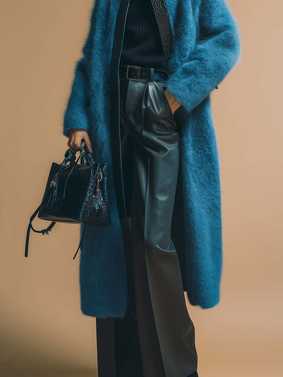 This simple and stylish blue knit cardigan is a versatile addition to your wardrobe, combining style and comfort. When the weather cools, pair it with jeans or a turtleneck for warmth and comfort. The loose fit is comfortable and convenient. The faux crocodile leather panels add a unique touch.