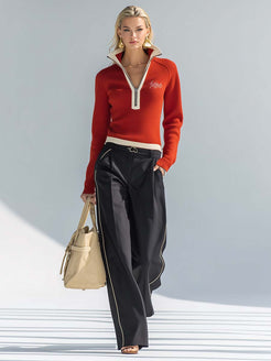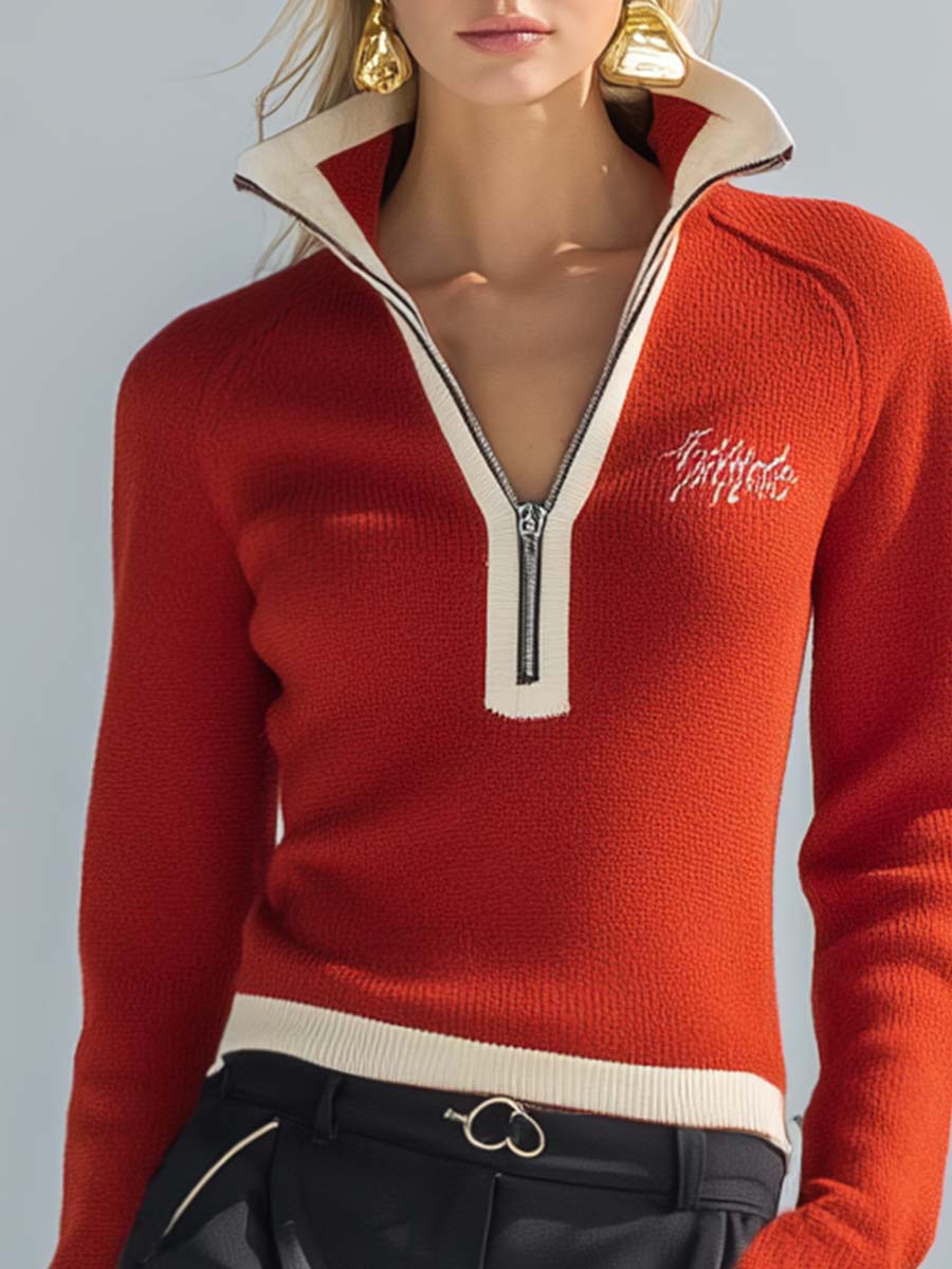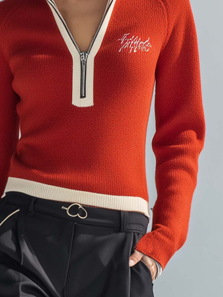 This Retro Fashion Sports Contrast Color Front Zipper Lapel Red Knitted Pullover Top is a perfect blend of vintage charm and modern style. The bold red color combined with contrasting details makes it a standout piece for any wardrobe. Featuring a functional front zipper and a classic lapel design, this pullover is both stylish and practical.