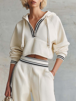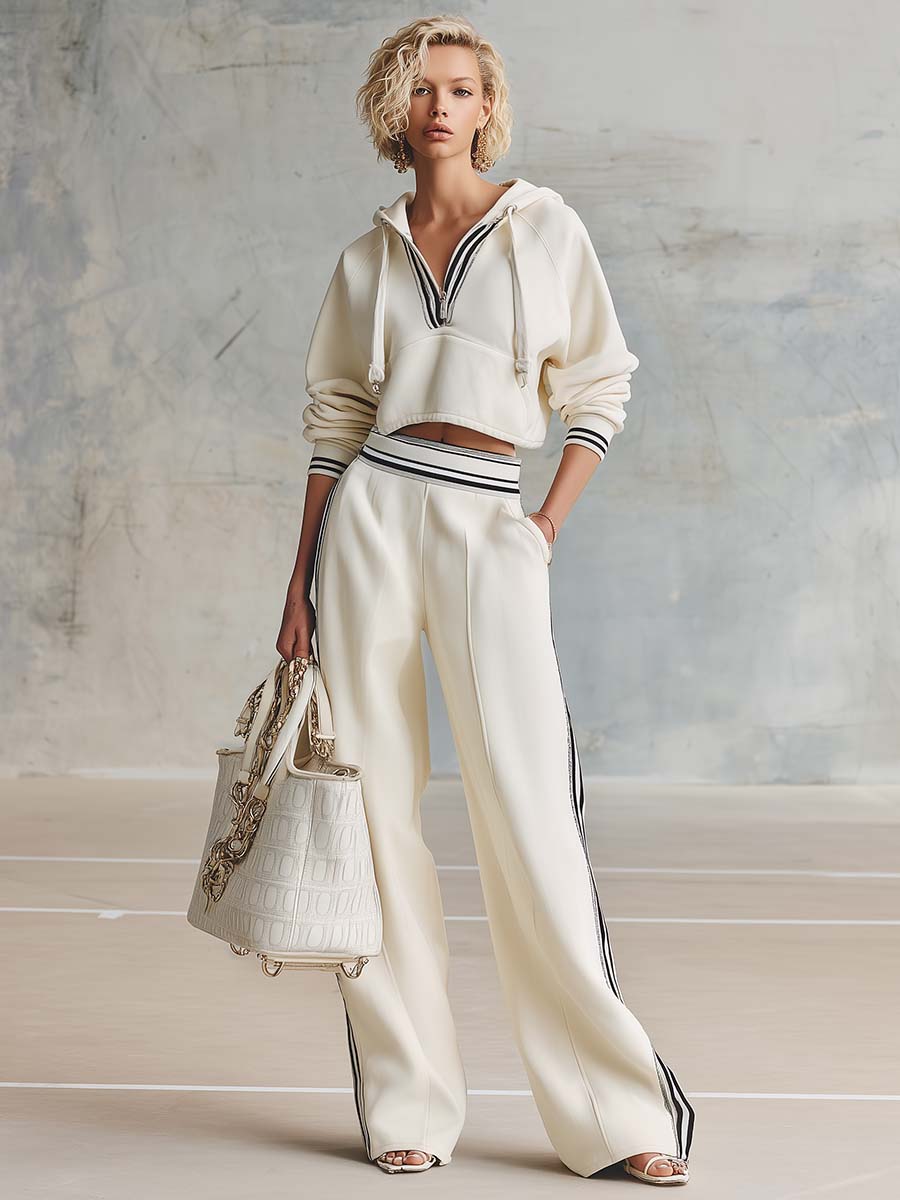 The Retro Fashion Sporty Cream Cotton Hooded Front Zipper Top And Pants Set is a stylish blend of vintage and sporty aesthetics. Crafted from high-quality cotton, this set ensures both comfort and durability. The creamy hue adds a touch of elegance while maintaining a casual vibe.
