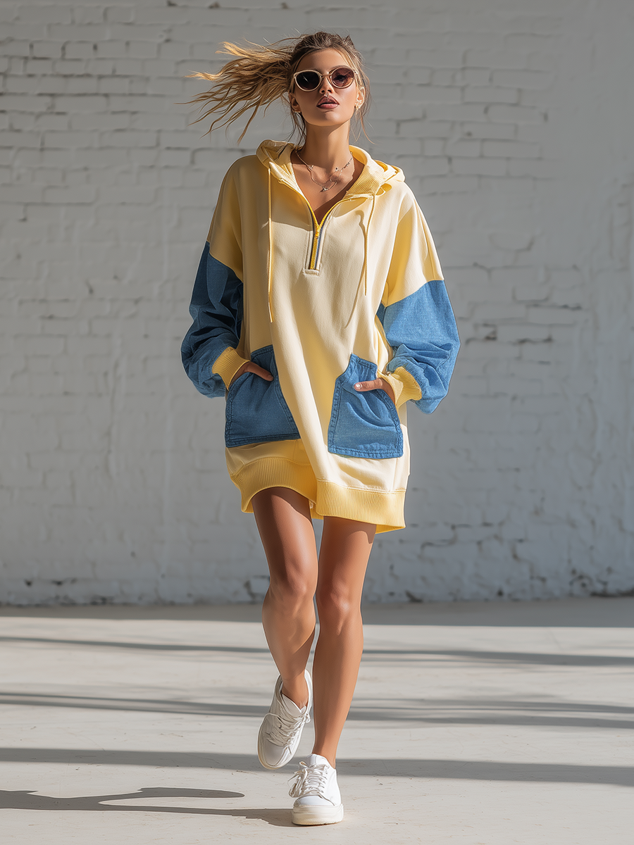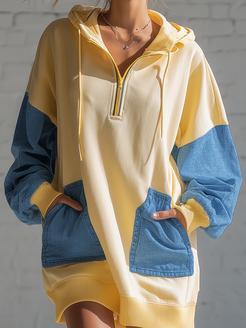 This denim yellow cotton mini dress is a versatile addition to any wardrobe, ideal for casual outings or weekend adventures. Its standout features such as the hood and front zipper make it a practical yet fashionable choice, ensuring you look and feel great on any occasion.