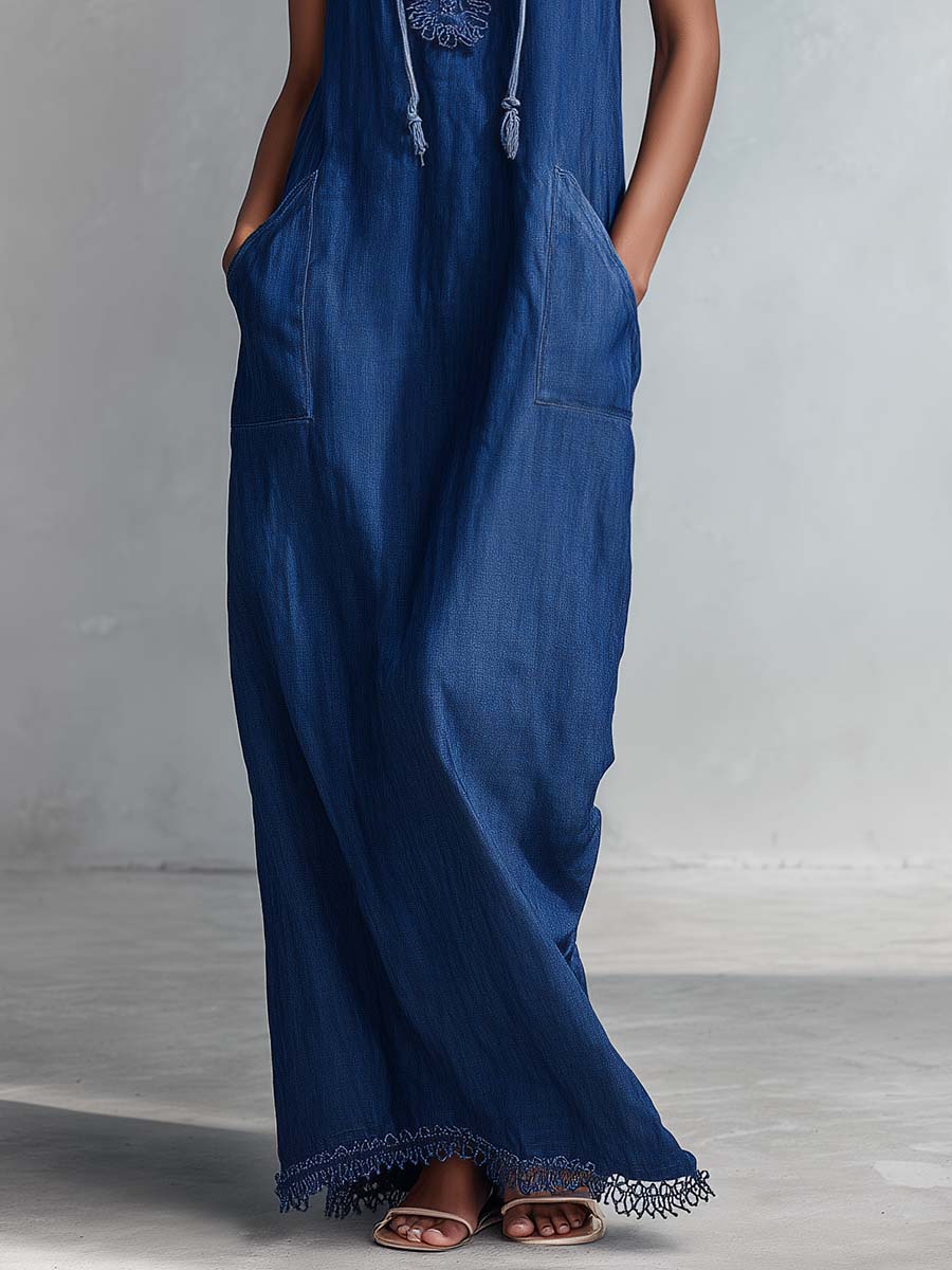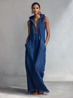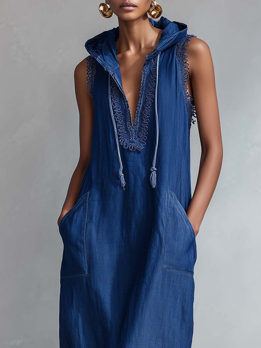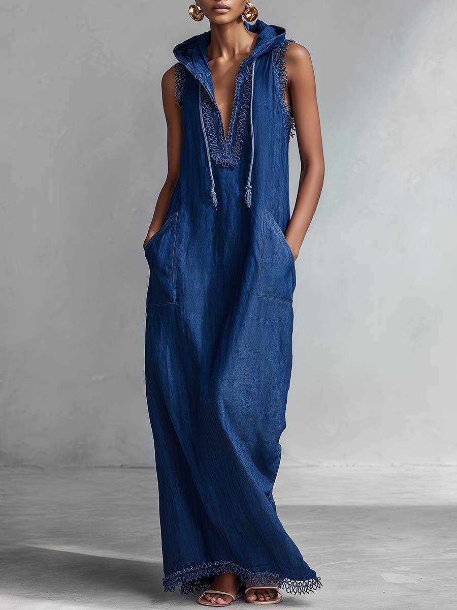 The Urban Casual Fashion Hooded V-neck Lace Trim Dark Blue Denim Maxi Dress is a unique blend of style and comfort. Crafted from premium dark blue denim fabric, this dress offers a sophisticated yet casual look suitable for various occasions. It features a hooded V-neck design, further accentuated by delicate lace trim detail, adding a touch of femininity to its urban chic vibe.