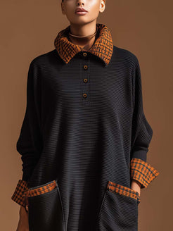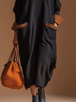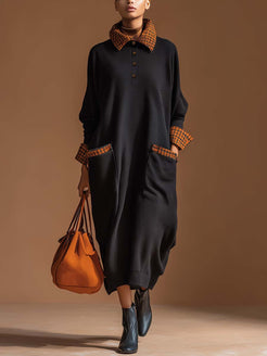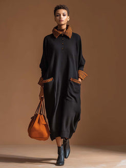 Embrace the elegance and charm of this stunning Vintage Exquisite Casual Midi Dress. This eye-catching piece combines a classic black knit with a vibrant orange plaid design, creating an appealing contrast that is both stylish and distinctive. The polo collar adds a subtle nod to traditional tailoring, while the large pockets offer practicality without sacrificing style.