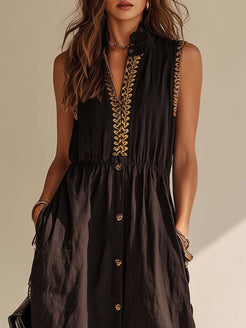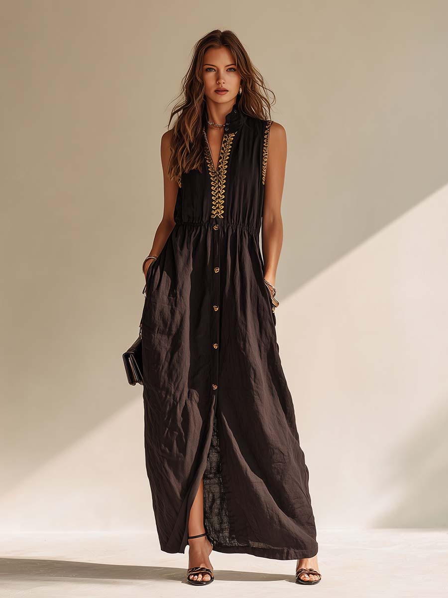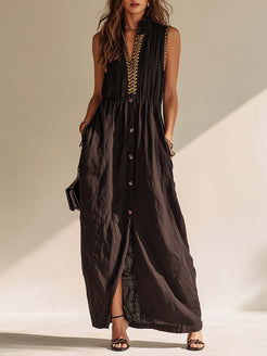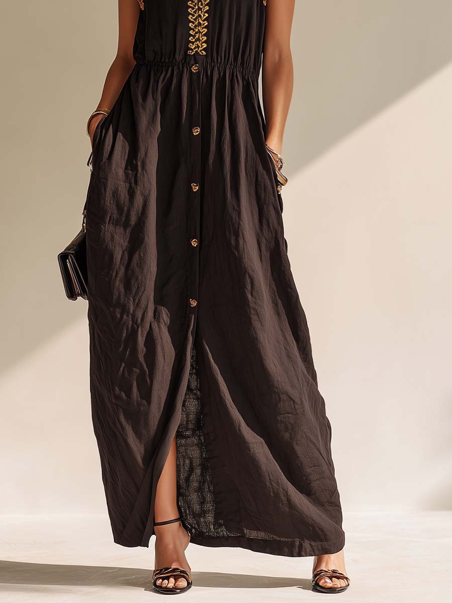 This vintage-inspired maxi dress is a testament to exquisite craftsmanship, featuring a beautifully embroidered design throughout. The dress boasts a flattering V-neckline and front-buttoned closure, making it both stylish and functional. Constructed from a luxurious blend of cotton and linen, it promises comfort and breathability in warm weather.