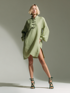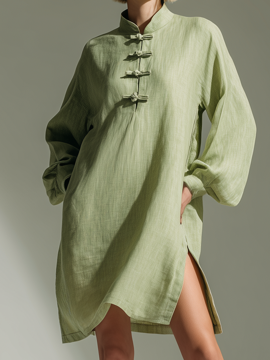 Vintage-style Loose-fitting Long-sleeved Stand-collar Frog Closures Linen Green Mini Dress