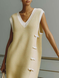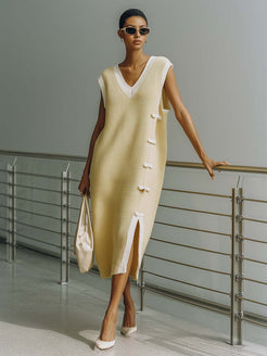 This sleeveless butter yellow dress is artfully crafted from a breathable and comfortable knit fabric, enhancing both elegance and wearability. It features a sophisticated round-neck design, making it a versatile choice for various occasions.