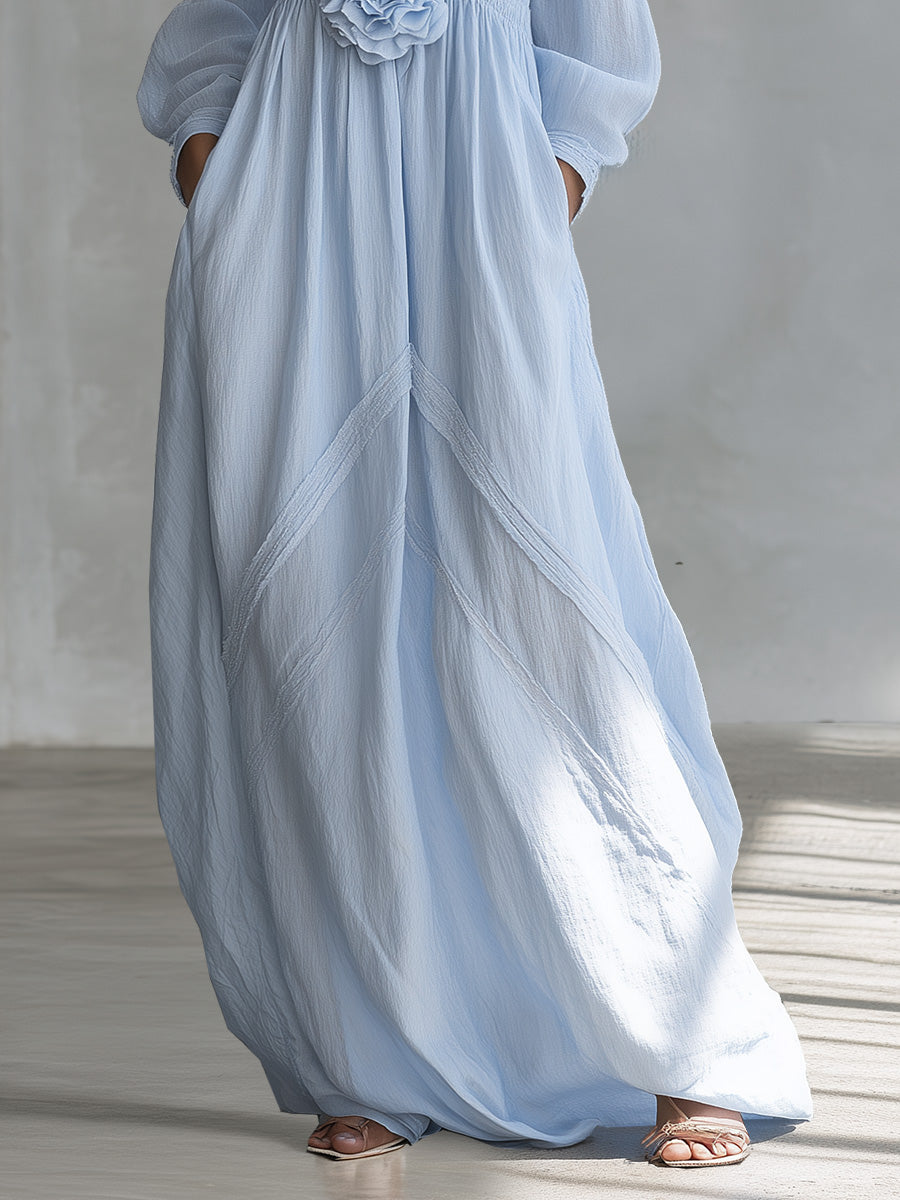 Introducing our Elegant Flowing Fashion V-neck Maxi Dress, crafted from a luxurious cotton-linen blend. This dress embodies grace and sophistication with exquisite 3D floral embellishments that add texture and a touch of romantic charm. The light blue hue complements every skin tone, making it a versatile addition to your wardrobe.