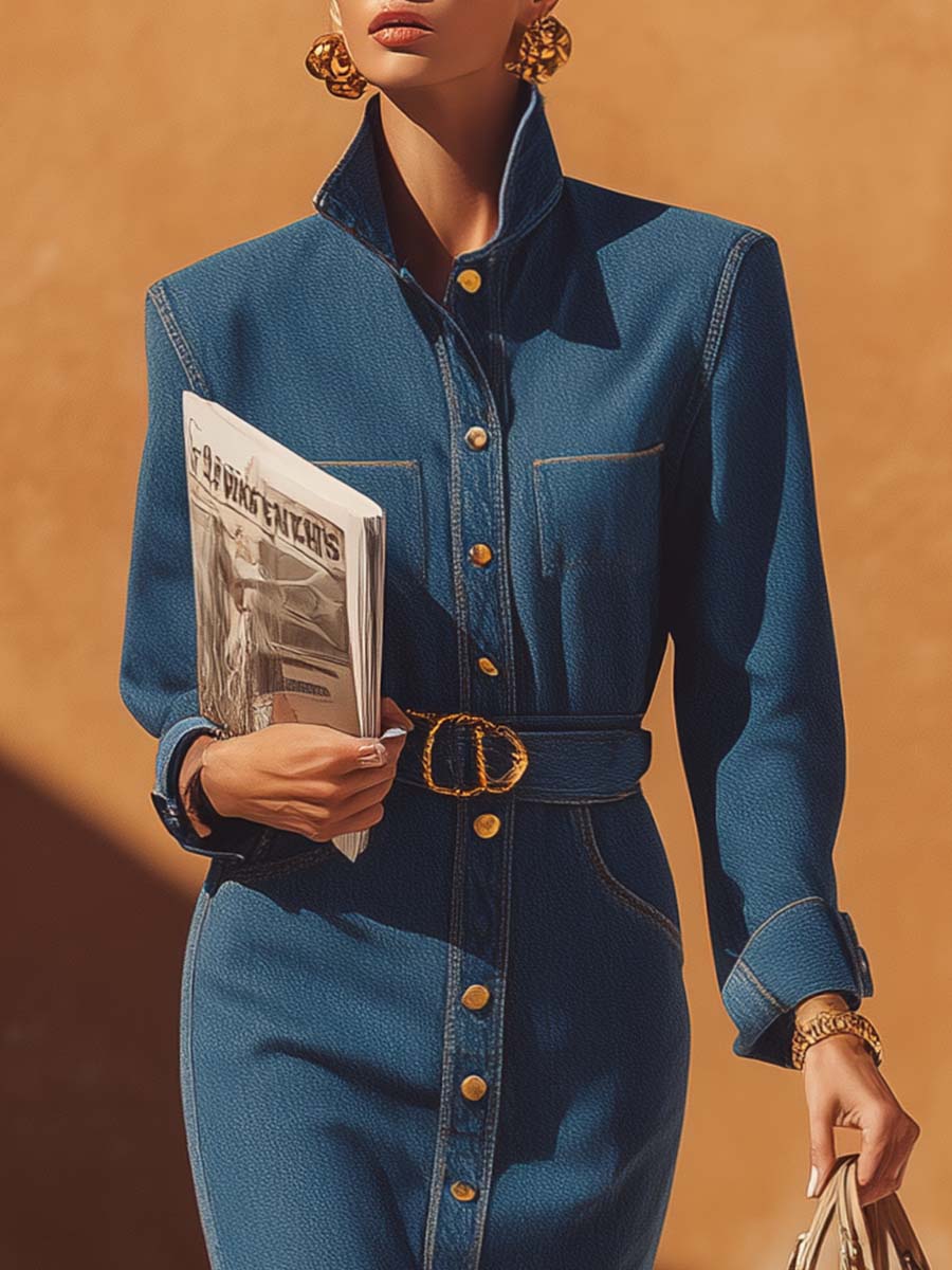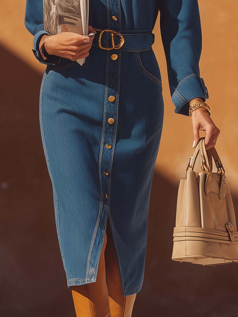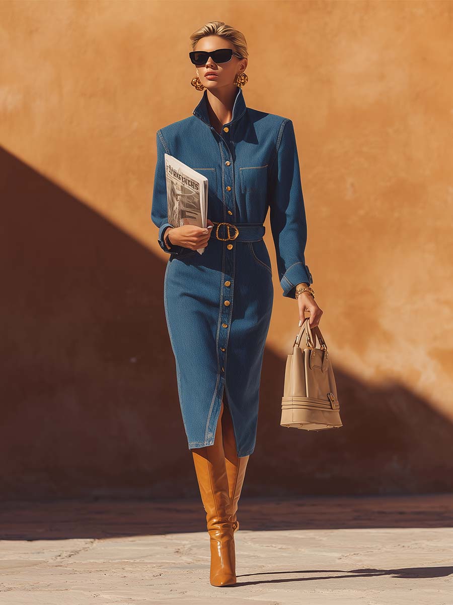 This denim midi dress can easily be styled up or down depending on the occasion. For a casual look, pair it with white sneakers and a crossbody bag. For a more polished appearance, opt for ankle boots and a leather jacket. Accessories like a statement belt or a silk scarf can add personal flair and elevate the overall ensemble.