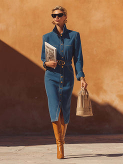 The Retro Fashion All-match Urban Lapel Front Button Blue Denim Midi Dress is a timeless piece that integrates the charm of vintage fashion with modern urban flair. Crafted from high-quality denim, this midi dress offers versatility and comfort, making it a staple in any wardrobe. Its classic lapel collar and front button closure add a touch of elegance and sophistication, perfect for casual outings or elevated settings.
