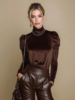 This vintage velvet top, with its turtleneck and puff sleeves, blends modernity with vintage elegance. Its fitted design is suitable for a wide range of wear, and its rich brown color exudes a vintage, sophisticated vibe, making it a versatile addition to any wardrobe.
