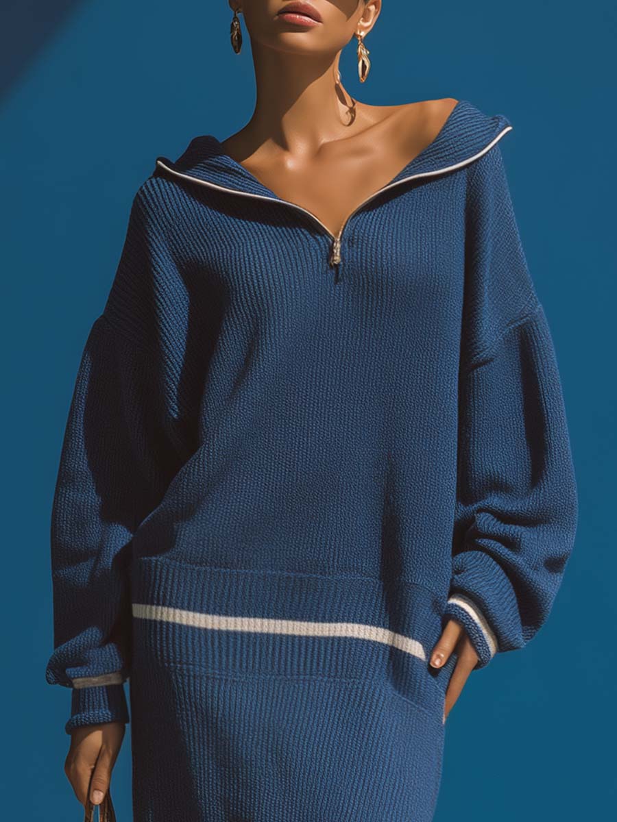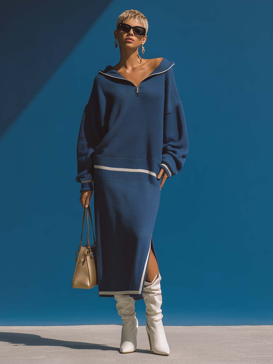 The Retro Urban Sports Blue Knitted Hooded Front Zipper Slit Midi Dress is a unique blend of contemporary urban flair with a retro twist. Crafted from soft, high-quality knit material, this dress promises comfort and warmth, making it perfect for casual outings or leisure wear. Its brilliant blue hue adds a vibrant touch to any wardrobe, ensuring you'll stand out wherever you go.