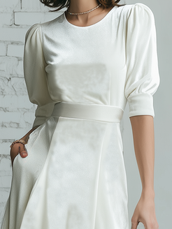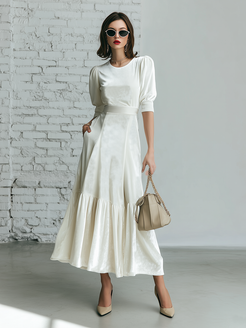 2. Design:Short-sleeved and round-neck,cinched waist,ruffled hem.
