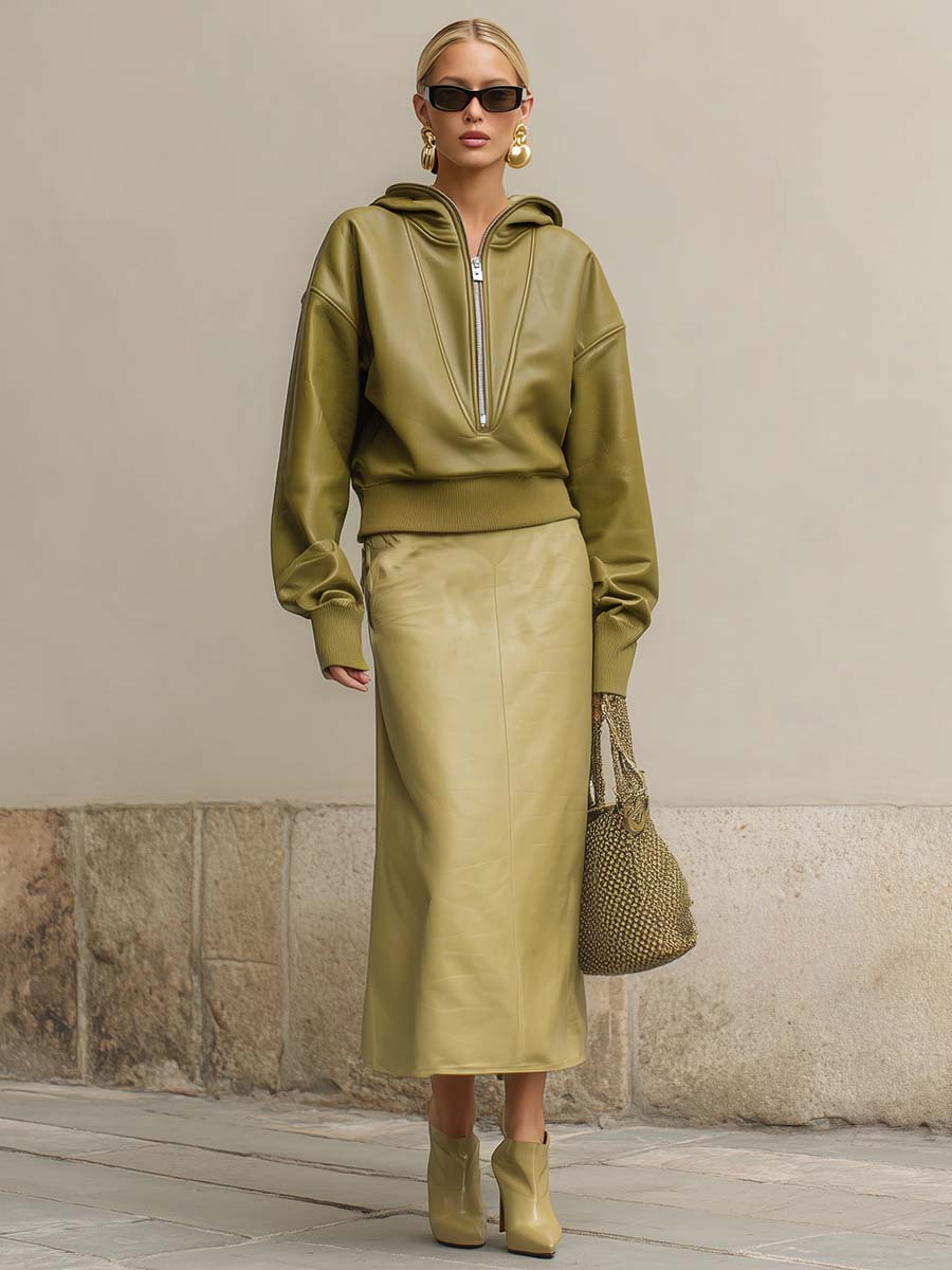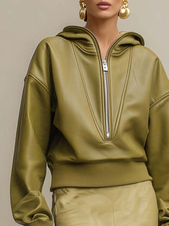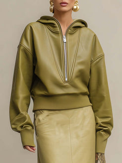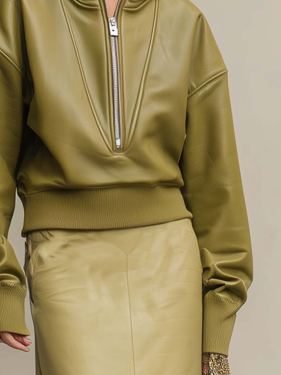The Temperament And Fashion Front Zipper Fruit Green Eco-friendly Leather Hoodie is a standout piece that seamlessly combines modern style with eco-consciousness. Crafted from sustainable leather, this hoodie shines in a vibrant fruit green color, making it an eye-catching addition to any wardrobe.