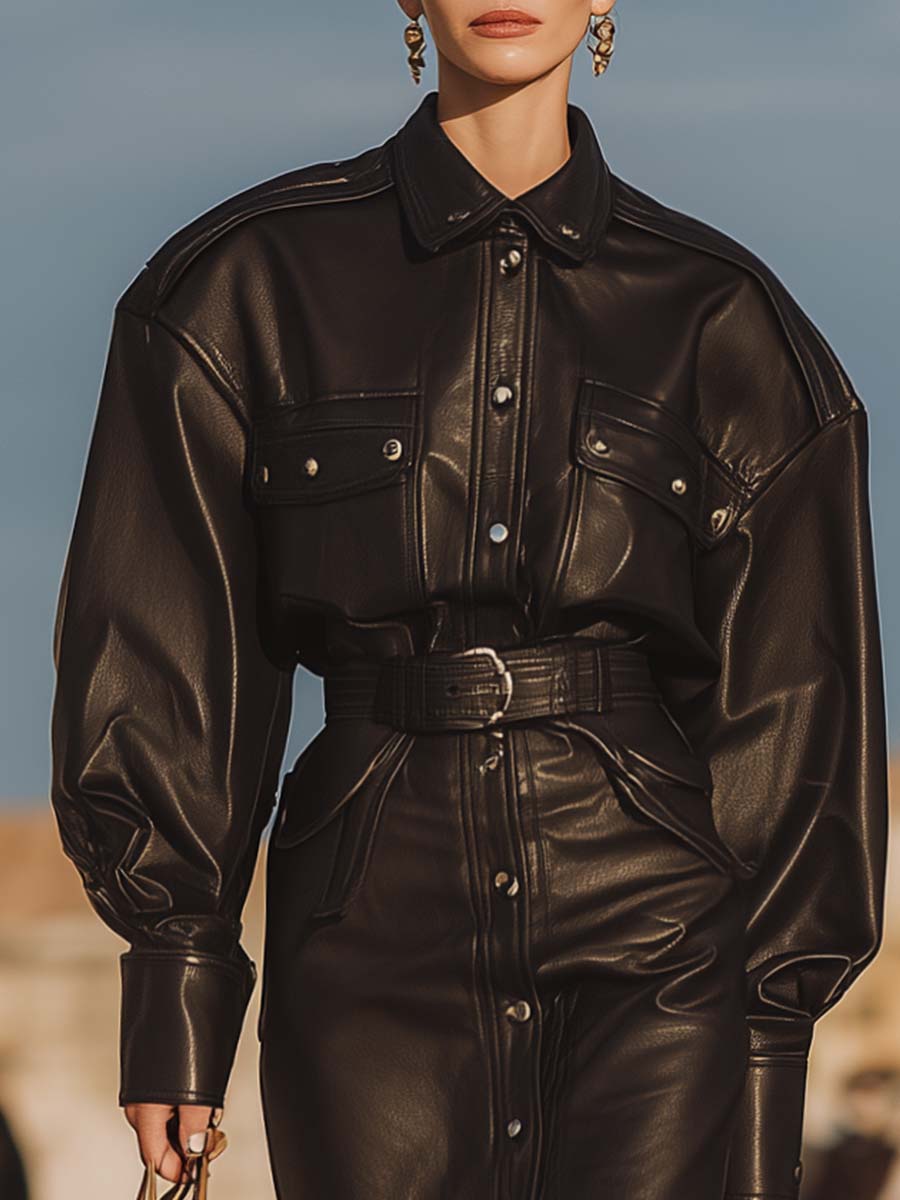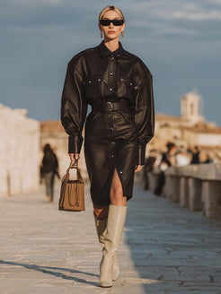 This stunning black midi dress features a retro-inspired design crafted from high-quality imitation leather. The dress is tailored with a wide shoulder design and front buttons, offering a sophisticated look that's both classic and modern. The luxurious texture and sleek silhouette make it a standout piece for any wardrobe.