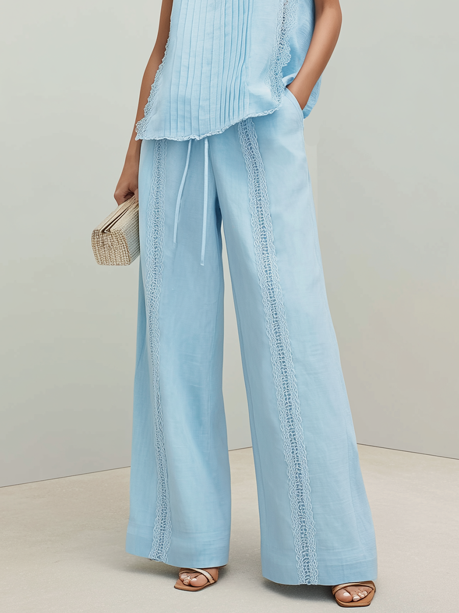 This casual and comfortable blue cotton blend sleeveless pleated top and wide-leg flared pants set is a versatile and stylish addition to your wardrobe. The set includes a sleeveless top with delicate pleats and a pair of fashionable wide-leg flared pants, all in a soft blue hue.