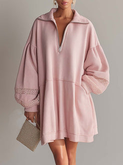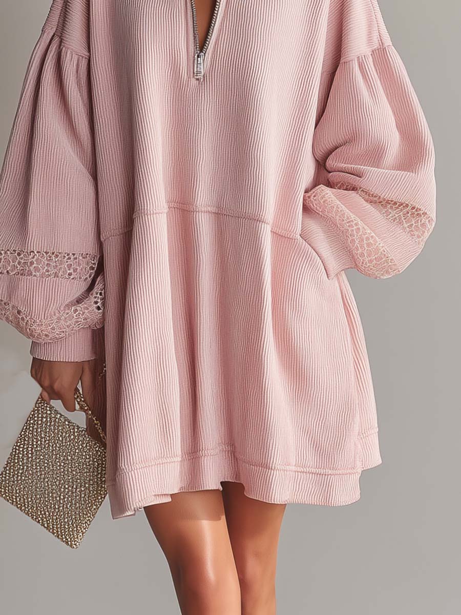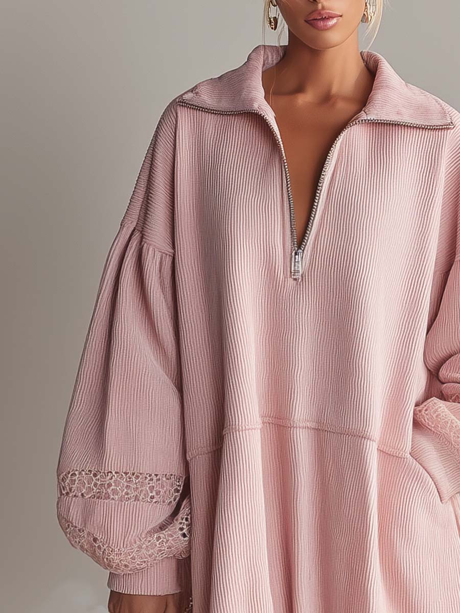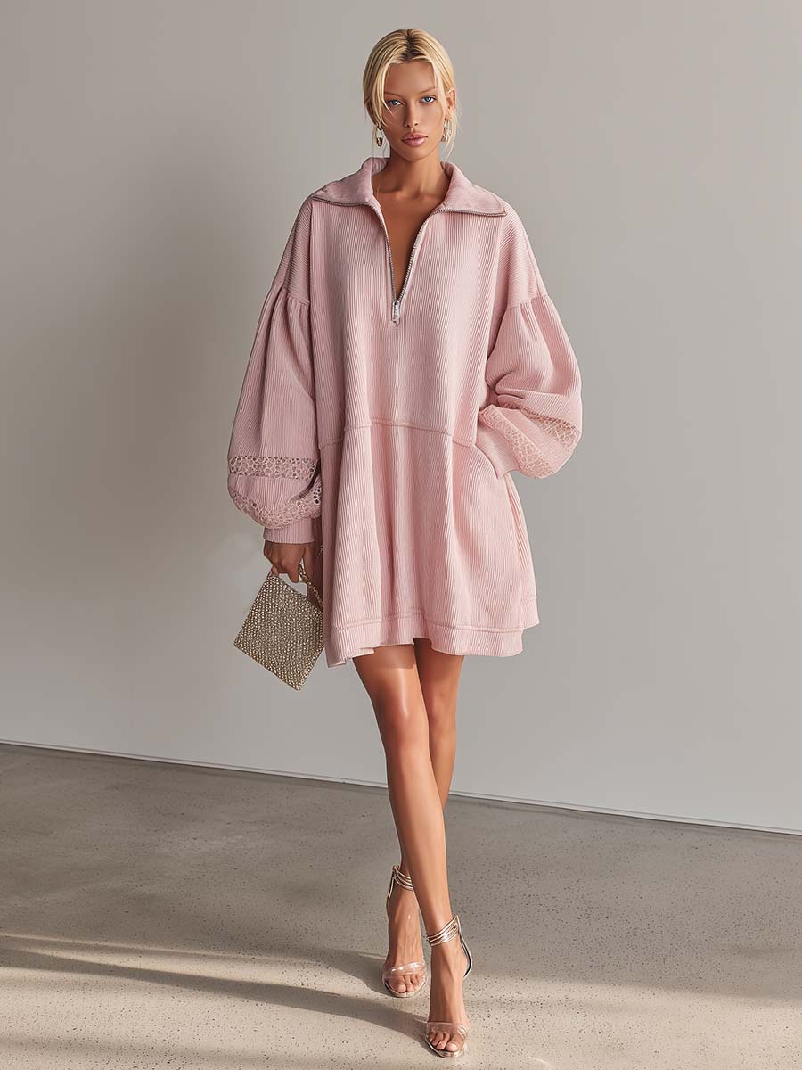 This Casual Fashion Loose Lapel Front Zipper Lace Trim Light Pink Corduroy Mini Dress is a stylish addition to any wardrobe. The soft, light pink corduroy fabric offers comfort and a chic look perfect for casual outings or semi-formal events. The dress features a unique combination of front zipper and lace trim, adding a touch of elegance to its casual style.