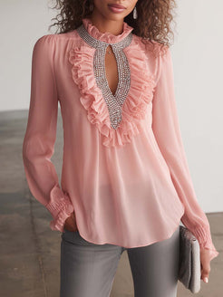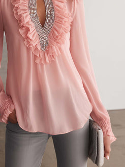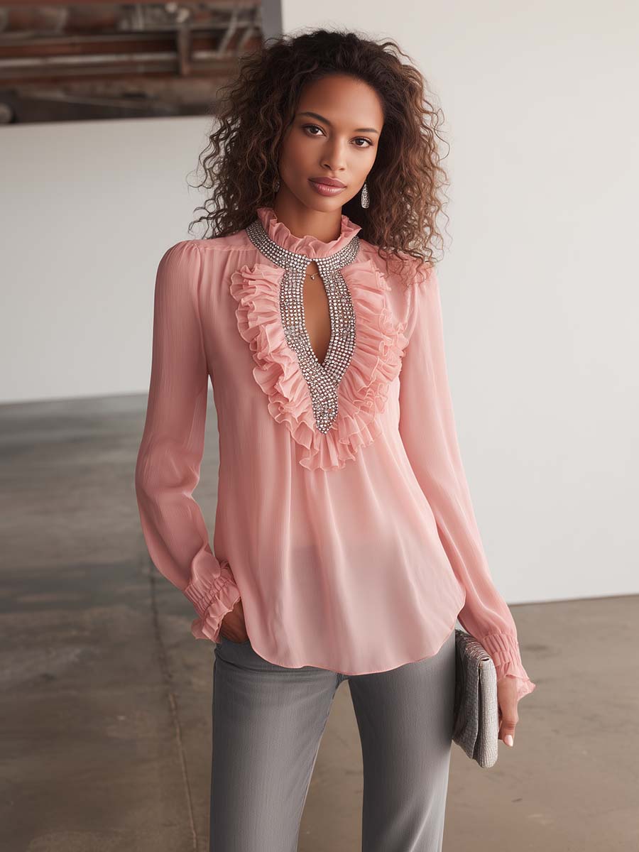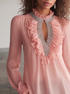 Introducing the Elegant Exquisite Ruffled Openwork Neckline Silver Chain Decoration Pink Chiffon Blouse, a true masterpiece of delicate fashion. This blouse features an enchanting pink hue that radiates sophistication and charm. Crafted from high-quality chiffon, it offers a lightweight and breathable experience, ensuring comfort throughout the day.