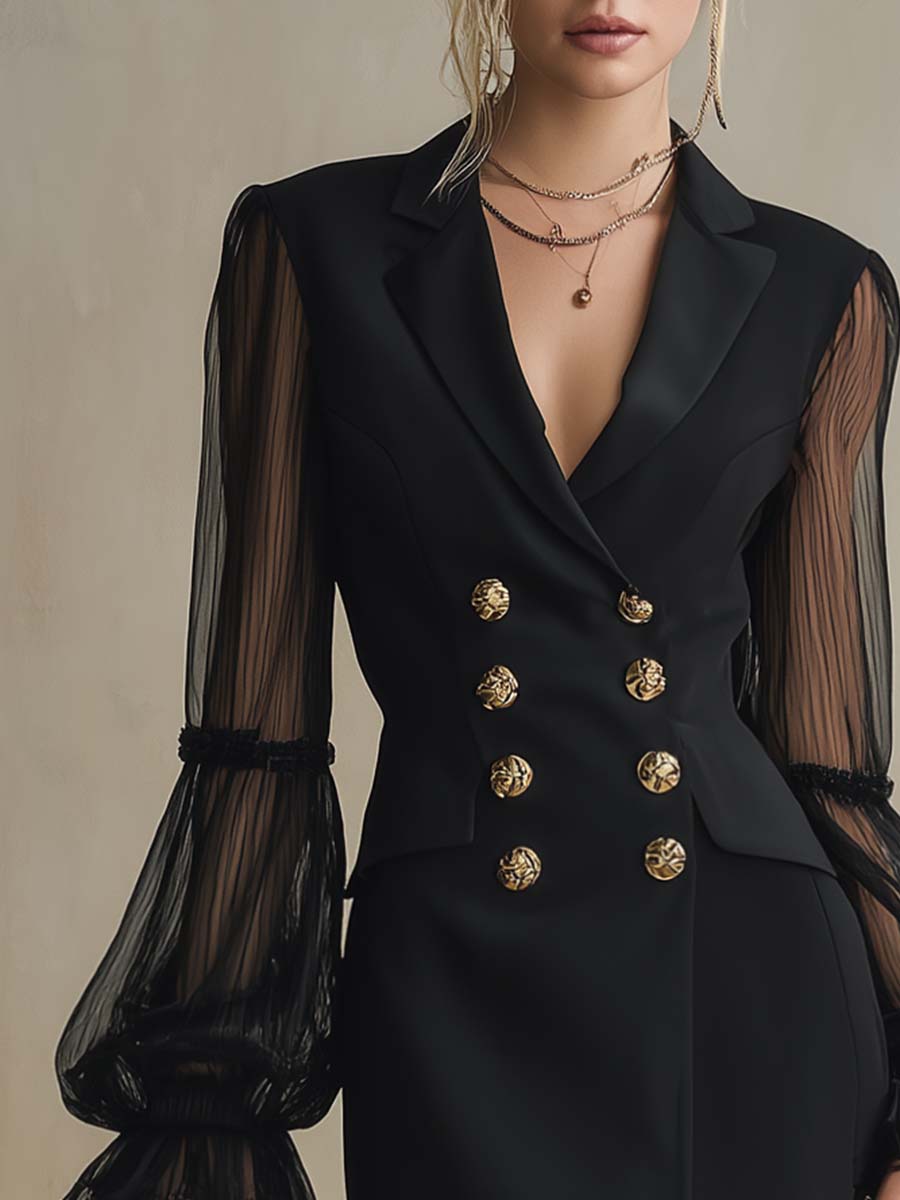 Introducing the Elegant Retro Notched Lapel Double-breasted Mesh Sleeves Black Blazer Style Mini Dress, a sophisticated addition to any modern wardrobe. This dual-purpose piece merges the timeless appeal of a blazer with the fashionable edge of a mini dress, making it ideal for various occasions, from formal gatherings to chic evening outings.