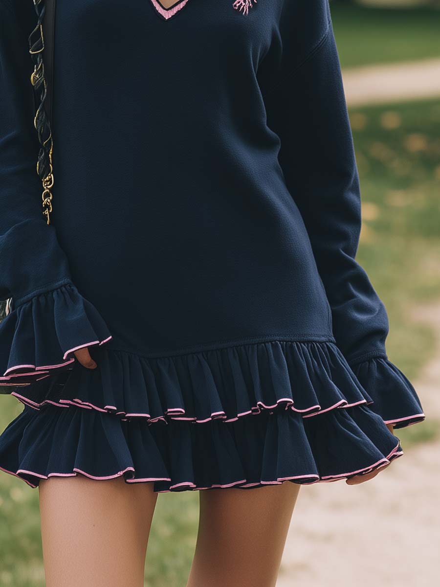 Introducing the elegant Retro Sporty V-neck Mini Dress, a true embodiment of style and comfort. Crafted from high-quality navy cotton, this dress is designed to deliver a sporty yet sophisticated look. Highlighted with delicate pink trim and a ruffled hem, the dress combines retro charm with modern aesthetics.