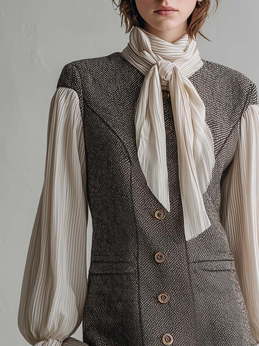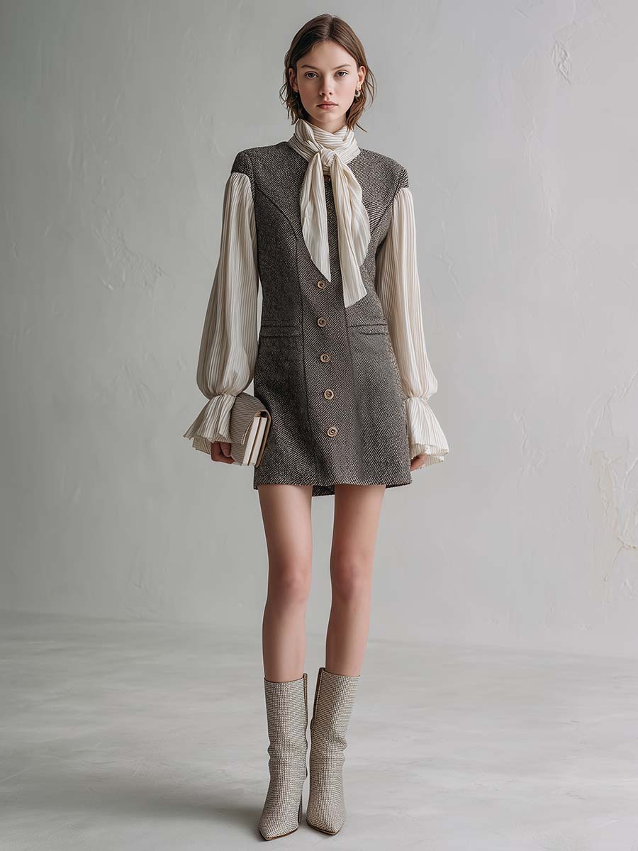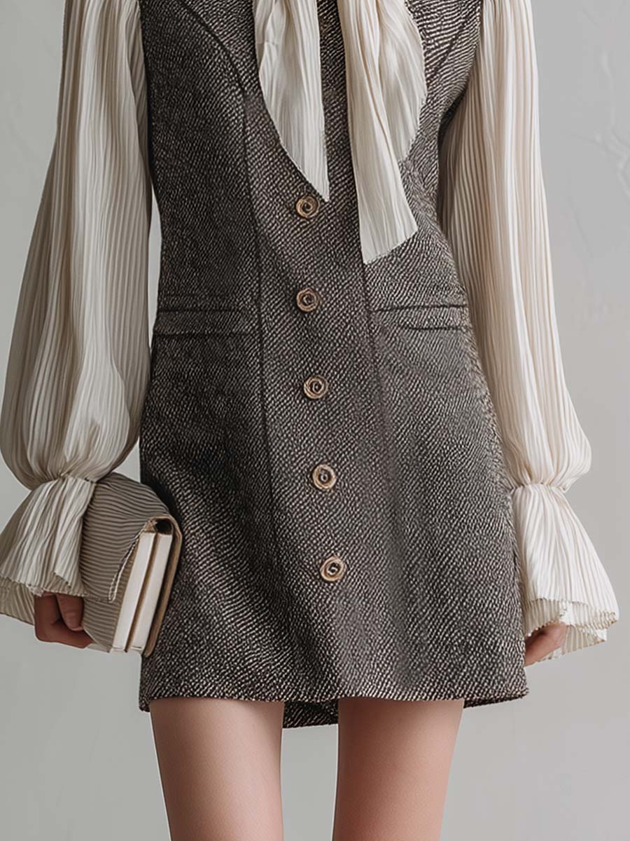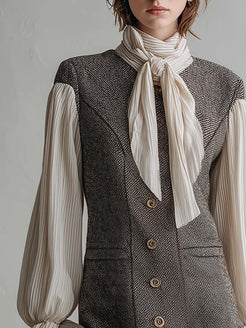 The Elegant Retro Tie-neck Chiffon Sleeve Gray Herringbone Mini Dress embodies a classic yet chic aesthetic. Crafted with a sophisticated gray herringbone pattern, this dress exudes elegance and a retro charm. The standout feature of this piece is its graceful tie-neck design, adding a touch of femininity and grace. Delicate chiffon sleeves elevate the overall look, making it perfect for any stylish outing.