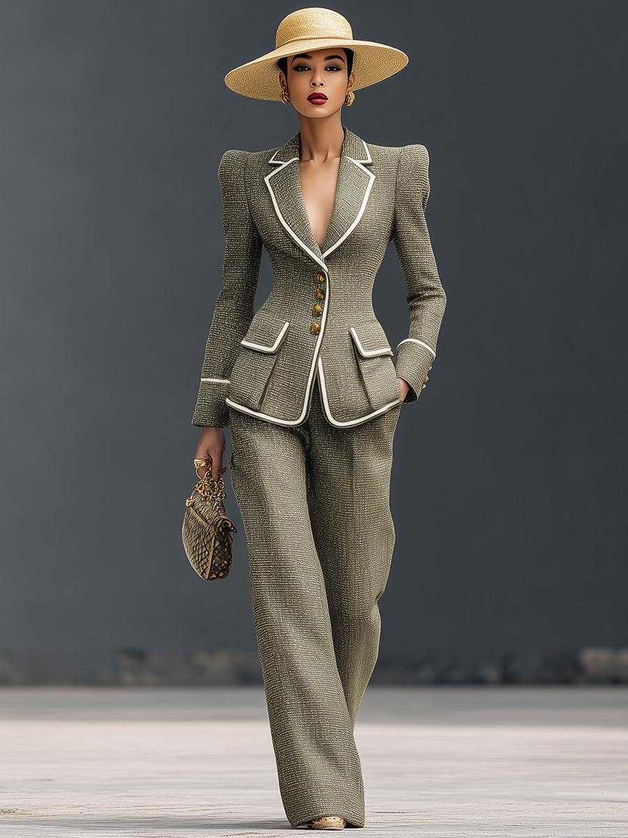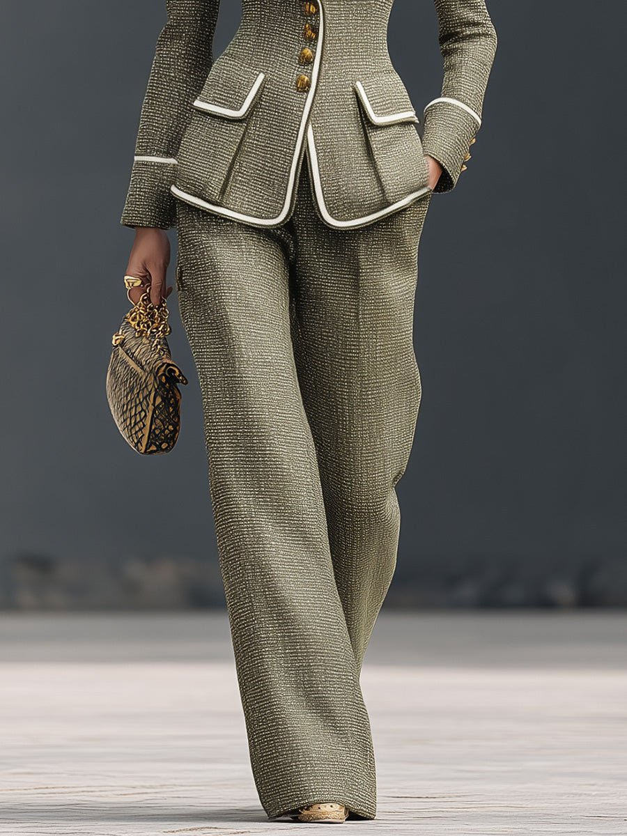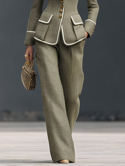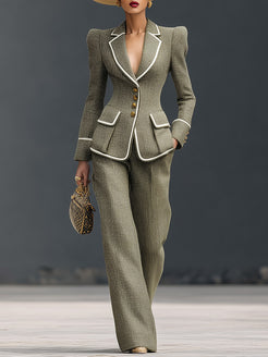 This sophisticated set can be paired with neutral-colored heels and a simple clutch for a polished look. For a more relaxed style, pair it with flats or sneakers and minimalistic accessories. A white blouse beneath the jacket can enhance the classic ensemble, making it suitable for office wear or formal gatherings.