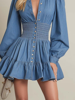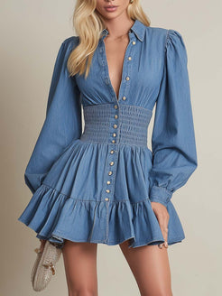 The Exquisite Fashion Lapel Front Button Bubble Hem Blue Denim Mini Dress is a stunning blend of contemporary style and classic design. Crafted from premium quality denim, this mini dress features a sophisticated lapel collar and convenient front button closure, offering both elegance and practicality.