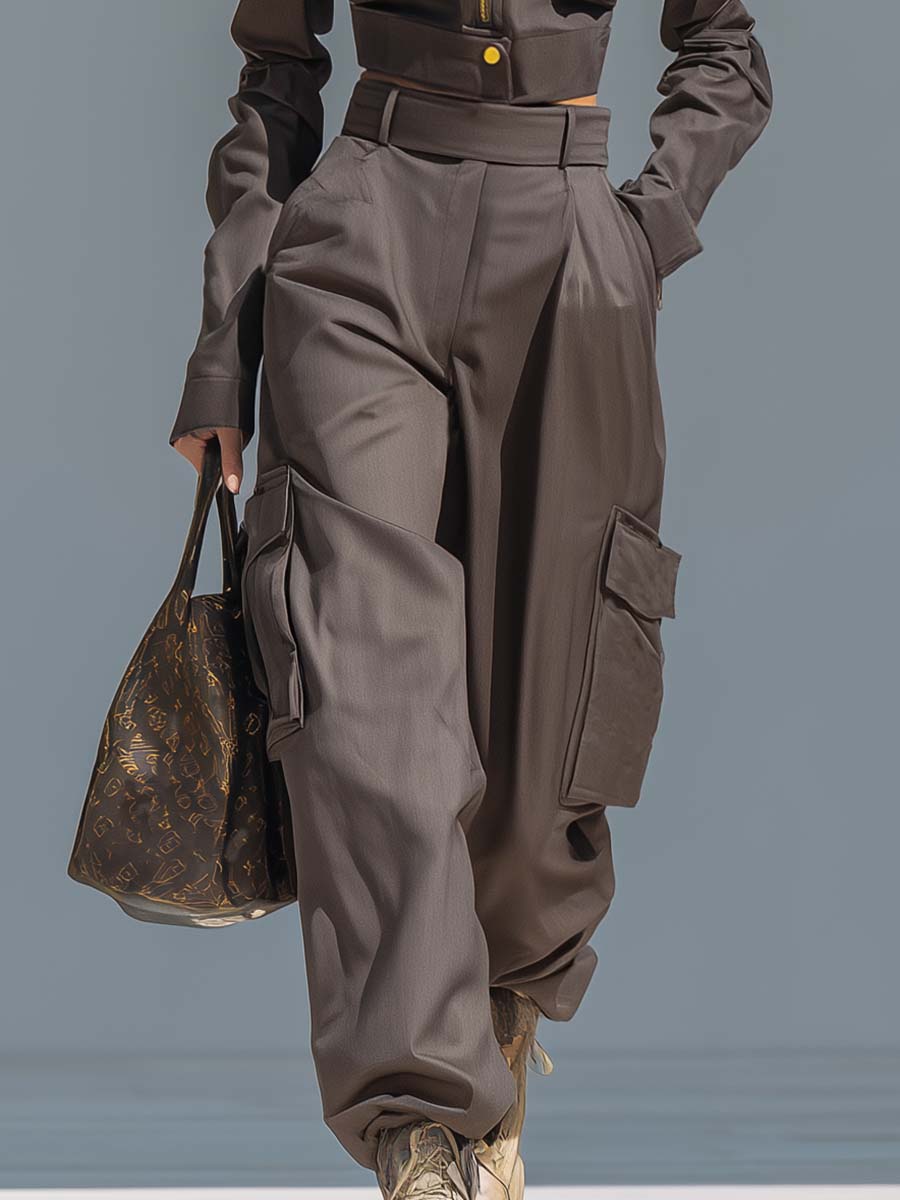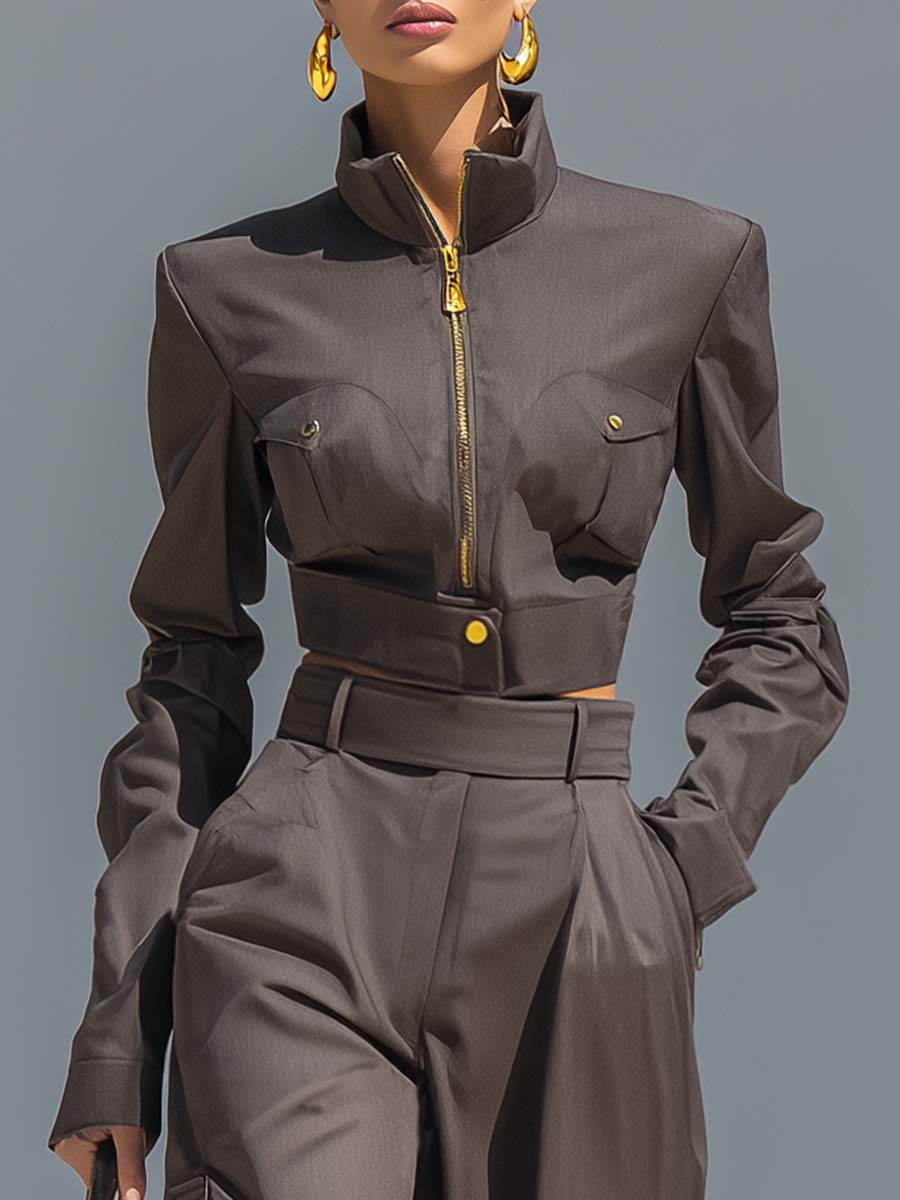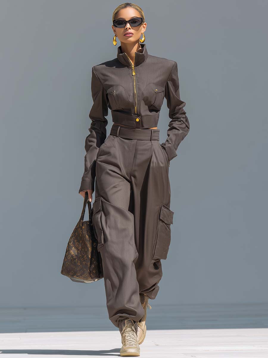 This Exquisite Street Fashion Set combines modern style with functional design in one chic ensemble. The set features a striking brown short jacket with a stand-up collar and front zipper. Accompanying the jacket are matching workwear wide pants, creating a seamless and trendy outfit perfect for any fashion-forward look.