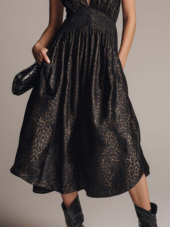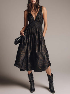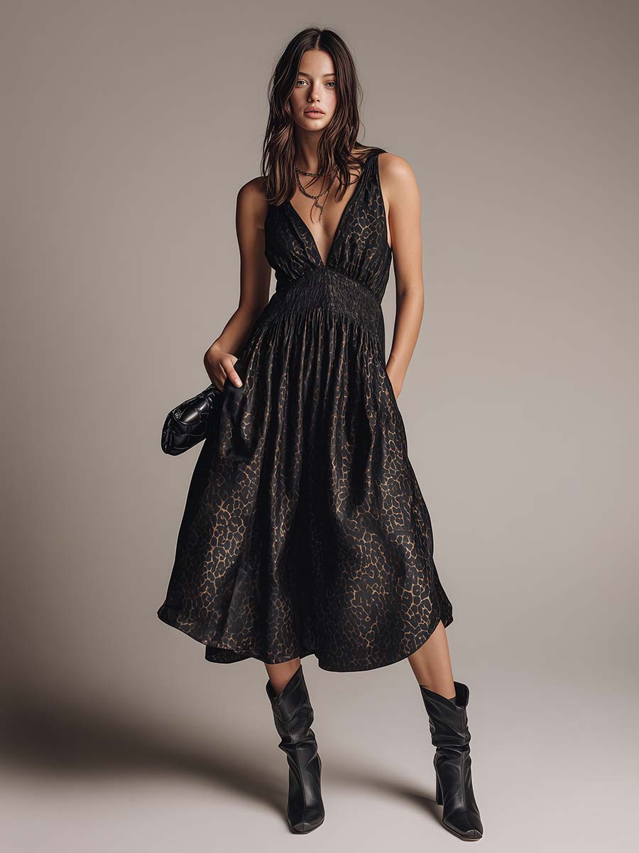 This Fashion Sophisticated Party Dress features a stylish V-neck design and sleeveless cut, perfect for any upscale gathering. The dress is made from luxurious black satin, embellished with an eye-catching leopard print pattern that adds a touch of wild elegance. Its puff hemline enhances its unique silhouette, making it a standout piece for any event.