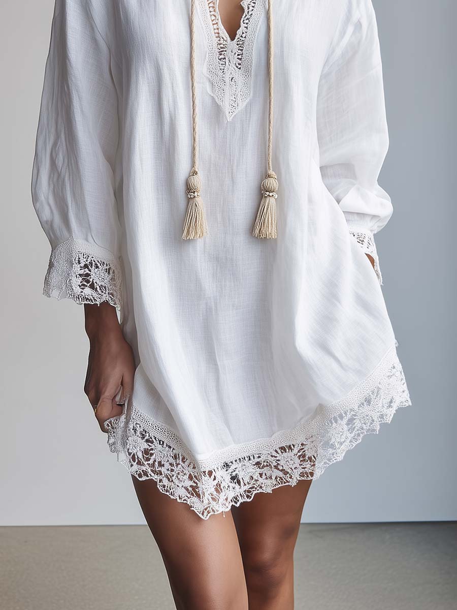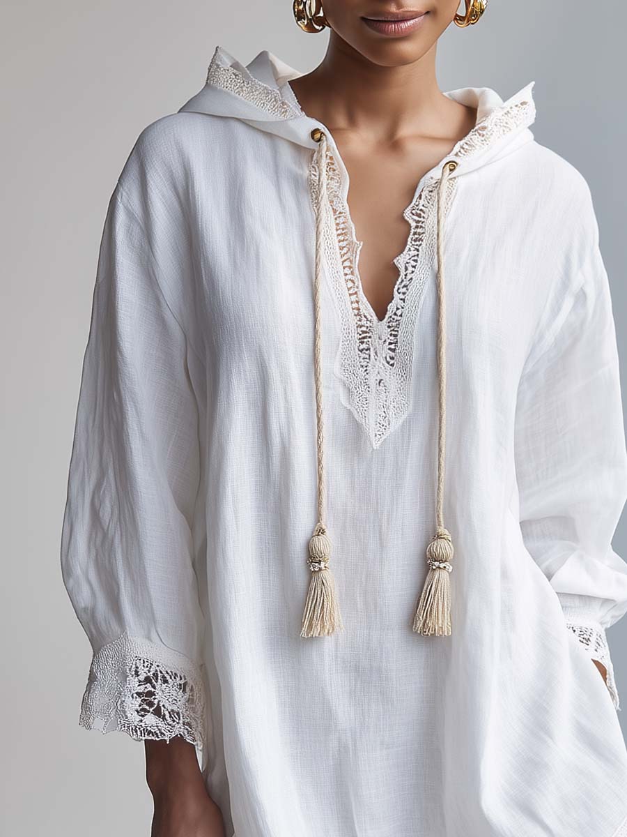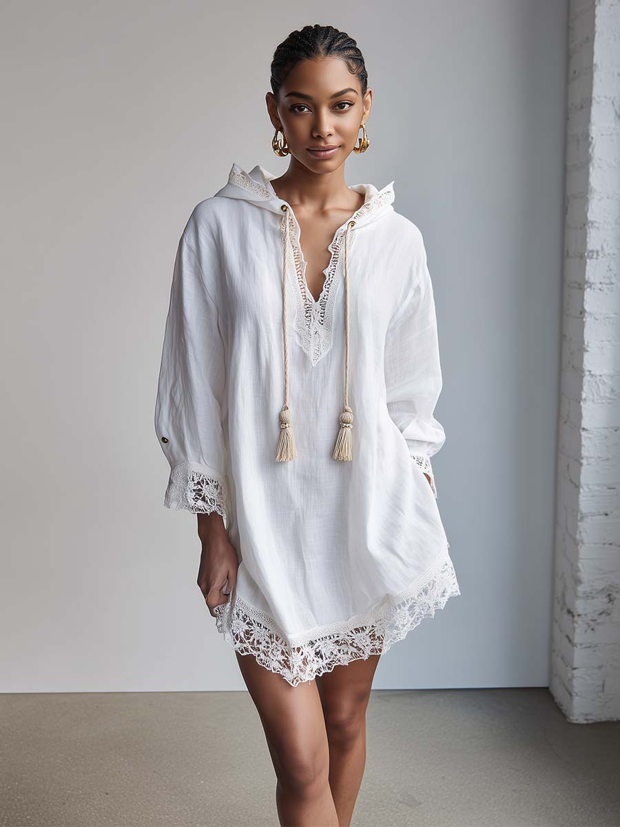 Discover the charm and elegance of the Retro Casual Hooded Lace-trimmed White Cotton And Linen Vacation Mini Dress. This exquisite piece combines vintage aesthetics with modern-day comfort, perfect for those seeking a unique style statement for their vacation wardrobe.