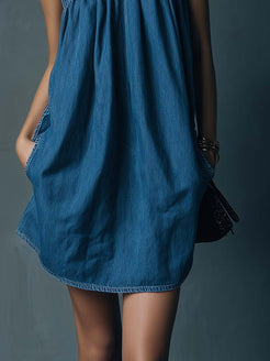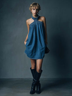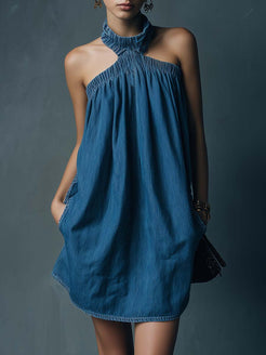 Introducing the Retro Casual Party Halter Neck Blue Denim Mini Dress, a versatile piece perfect for those who love a blend of vintage and modern styles. This chic denim mini dress features a halter neck design, giving it a stylish and trendy appeal that is perfect for casual outings or laid-back parties.