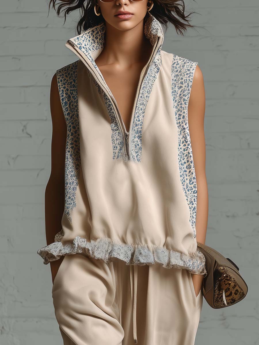2.Design: Collared, front zip closure, sleeveless, leopard print trim, side pockets, shorts.