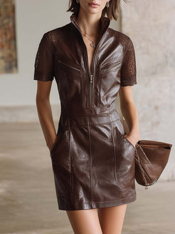 This Retro Handsome V-neck Front Zipper Mesh Short-sleeved Brown Faux Leather Mini Dress offers a chic combination of classic and modern aesthetics. Created with faux leather, the rich brown color delivers a bold yet sophisticated look. The mini dress features a V-neckline and a front zipper, lending a hint of edgy charm that is both attractive and timeless. Mesh short sleeves add a unique element, enhancing the dress's dynamic style.