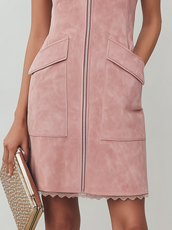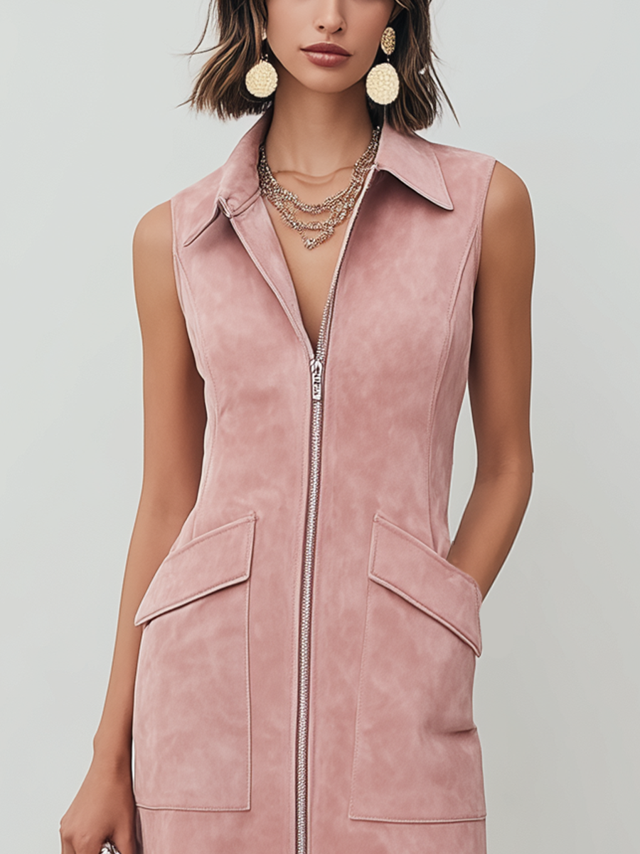 Showcase your unique style with this fashionable and cool pink faux suede collared sleeveless mini dress! Featuring a bold collar design and a convenient front zipper closure, it combines style and practicality. Two functional pockets on the sides add a touch of chic to the feminine silhouette.