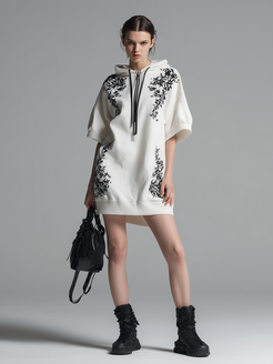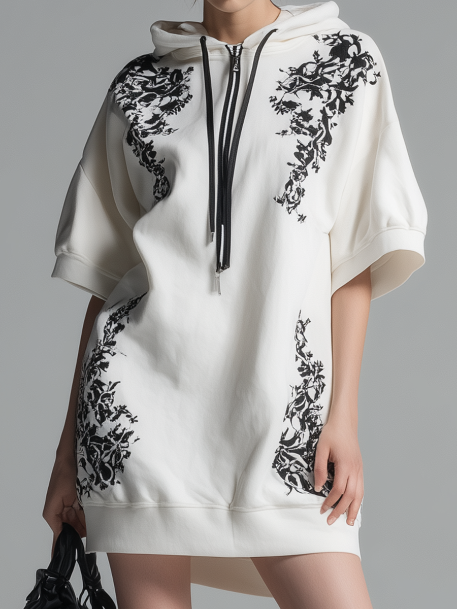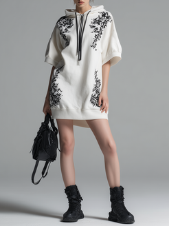 This Stylish Simple Short-sleeved Loose-fitting Hooded Print White Mini Dress is a versatile addition to any wardrobe, ideal for those who love to blend comfort with fashion. Its minimalistic yet interesting design makes it suitable for various occasions, from casual outings to relaxed weekends.