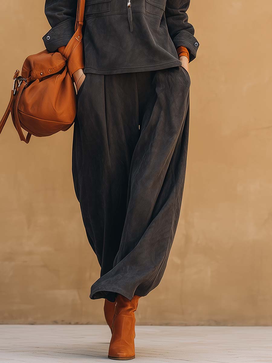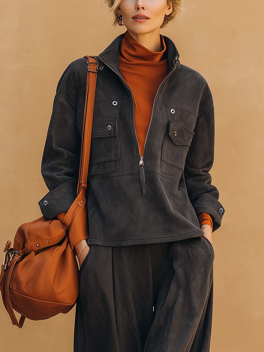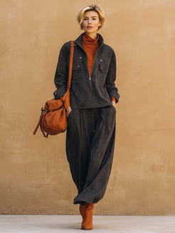 The Vintage Casual Sporty Dark Gray Suede Stand-up Collar Front Zipper Sweatshirt and Wide-leg Pants Set is a stylish yet comfortable ensemble. The set prominently features a dark gray hue that embodies a classic, versatile aesthetic. The sweatshirt comes with a stand-up collar and a convenient front zipper, offering both functionality and a contemporary edge. Accompanied by wide-leg pants, this set exudes a relaxed yet elegant vibe, perfectly suitable for casual outings or lounging.